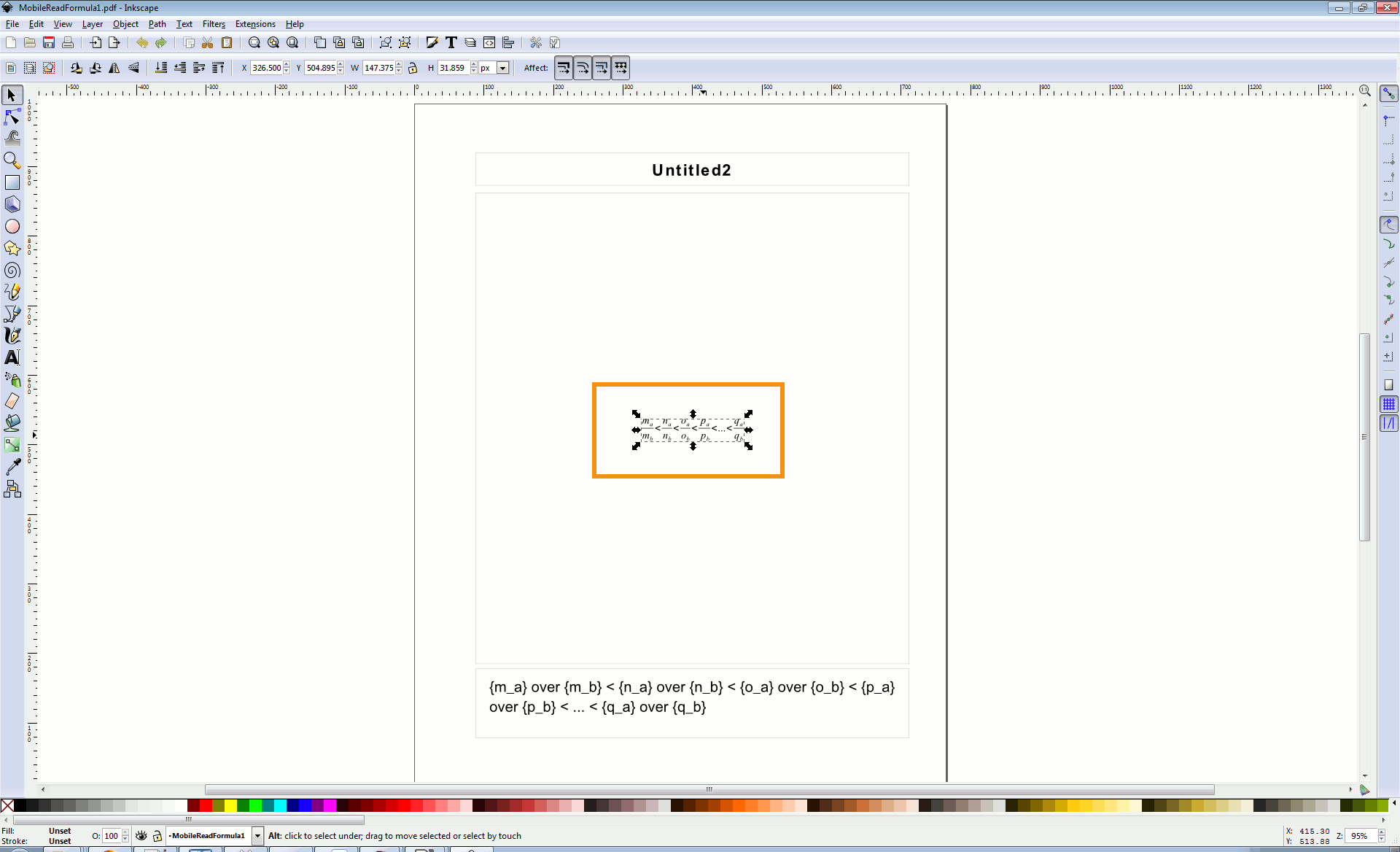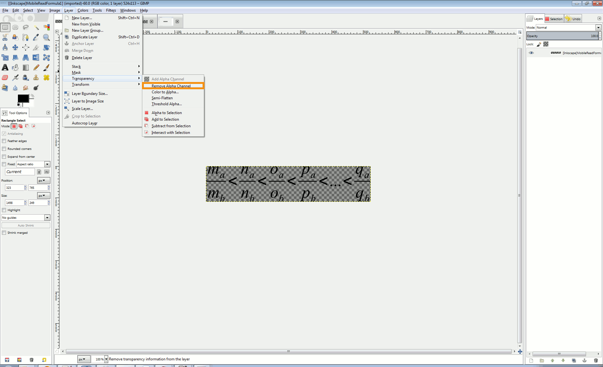 When you open Inkscape, you should be greeted with a blank screen. Press File - Open. Go to where you saved your LibreOffice Math PDF files, and open the first one: You will be greeted with this screen. Just press Ok: You can now see the PDF that LibreOffice created open in Inkscape. Now you have to click on the formula, and arrows should appear around it: Side Note: IF you are greeted with the entire thing surrounded by arrows. Press Object - Ungroup. This should split it into clickable sections. It should now be possible to press on the formula. Make sure just the formula is selected and has arrows around it, and press File - Export Bitmap... The Export Bitmap dialog should pop up. This is where you Inkscape what resolution the final PNG will be, and where to save the PNG. IMPORTANT: Make sure along the top, that the "Selection" button is chosen. Selection means it will create a PNG of everything that is inside the "surrounding arrows". Personally, I have settled on "320" as a good DPI for formulas. This determines how large the letters/numbers will be in the final PNG (and thus, the EPUB). Feel free to raise/lower this to suit your liking. You can also manually tell Inkscape which X/Y resolution you want created by changing the "Width" and "Height". Side Note: I recommend keeping the DPI the same throughout an entire book, so when formula PNGs are scaled to their max width, they will all have the same size font. After setting the DPI (or Width/Height), press Export. This will now save the file to the location you selected. Side Note: Inkscape auto-names the file g#####.png. This is quite annoying. Make sure you change to a better filename so you can keep the images organized. Repeat Step 3 for all formulas until you have 320 DPI PNGs generated for all Formulas. Step 4: GIMP Open GIMP, and open the PNG formulas created from Inkscape. Press Layer - Transparency - Remove Alpha Channel: This should result in the transparent background turning white: Since there is no color in this image, you want to change the mode from RGB to Grayscale. Note: Going from RGB (nearly every color under the sun) to Grayscale will cut down the filesize DRAMATICALLY. "Grayscale" means it will be 256 shades of gray. Press Image - Mode - Grayscale. Now we have to save the PNG again. Press File - Export... Choose where you save your file and what to name it. IMPORTANT: Make sure that ".png" is at the end of the filename. This will tell GIMP to Export this as a PNG. Uncheck all the boxes in the dialog box, and make sure Compression is set to max. Press Export. Repeat Step 4 for all Formulas. Step 5: Insert into the EPUB That is all! Now you can insert the PNG into the EPUB just like you would any other image. I have attached a sample EPUB full of the real world text, with two XHTML files: "Old" and "New". The "Old" has PNG snapshots taken from the PDF, while "New" has the new PNGs generated by this tutorial. Feel free to compare them both for yourself. Side Note: I have left an Extra Credit image (the formula at the top of Page 182: See Step -1). See if you can generate a new and improved version using the Tutorial above! If you need a hint with the Libre Math "code" for the Extra Credit: Spoiler: