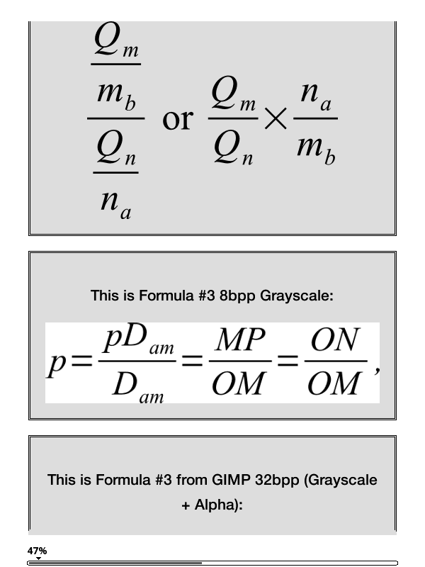 The bug: I believe these images will speak for themselves: On to the causes of the Bug: This is all just educated guesses. I used Imagemagick's "identify -verbose" on all 4 versions of Formula #1 (verbose output attached to this post). After comparing the output closely, I can see that the only major difference between Inkscape's version and GIMP's version is between color type: https://en.wikipedia.org/wiki/Portab...cs#Color_depth Inkscape's is set to 6 (RGB + Alpha) while GIMPs is set to the proper 4 (Grayscale + Alpha). Guess: Perhaps KindleGen can't handle PNG Color Type 4 images? Request: Can someone with a lot more image experience create Grayscale + Alpha images and feed them into KindleGen/Previewer? Perhaps try to create them from a different program besides GIMP (maybe Photoshop, or the multitude of others). Edit: I just tested this on my Nook + ADE, and it seems like ADE likes to break on the ScriptPNG (Indexed + Transparency), but works fine on the others. The causes of this one? No clue, maybe an Indexing + transparency is EXTREMELY rare. I would say avoid Transparency PNGs for now.