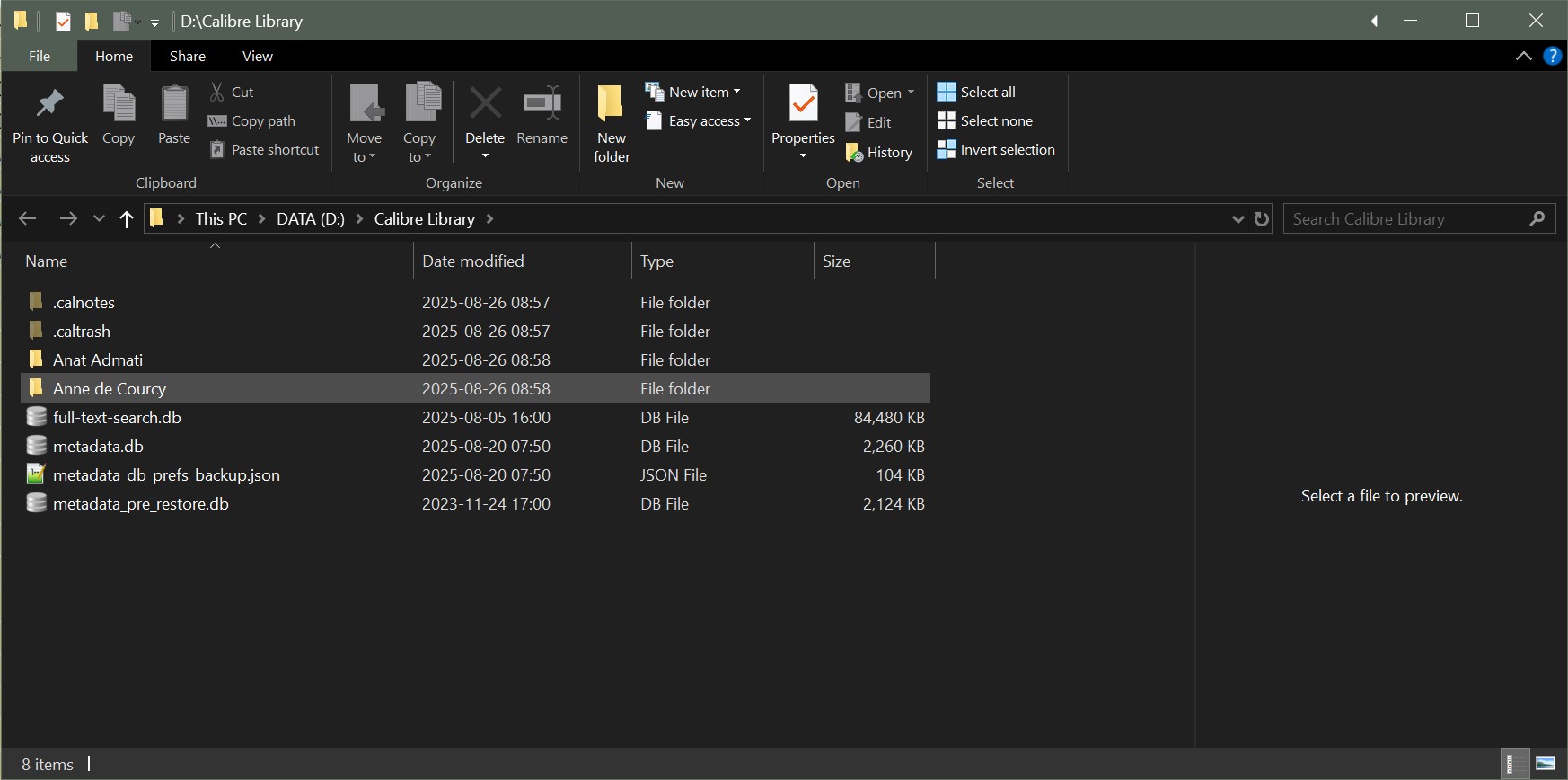 Hi, everyone. I've been using Calibre for years to convert files for my indie publishing company, and never had a single problem. But something went waka when I copied all my files to a new external hard drive. For some reason, even though all my book folders are still in my Calibre folder, they're no longer showing up in Calibre. Only the most recent book I processed, as a test, is showing up. And it's showing up with (1) after the folder name instead of (6317) which is what the other copy of the same book shows.