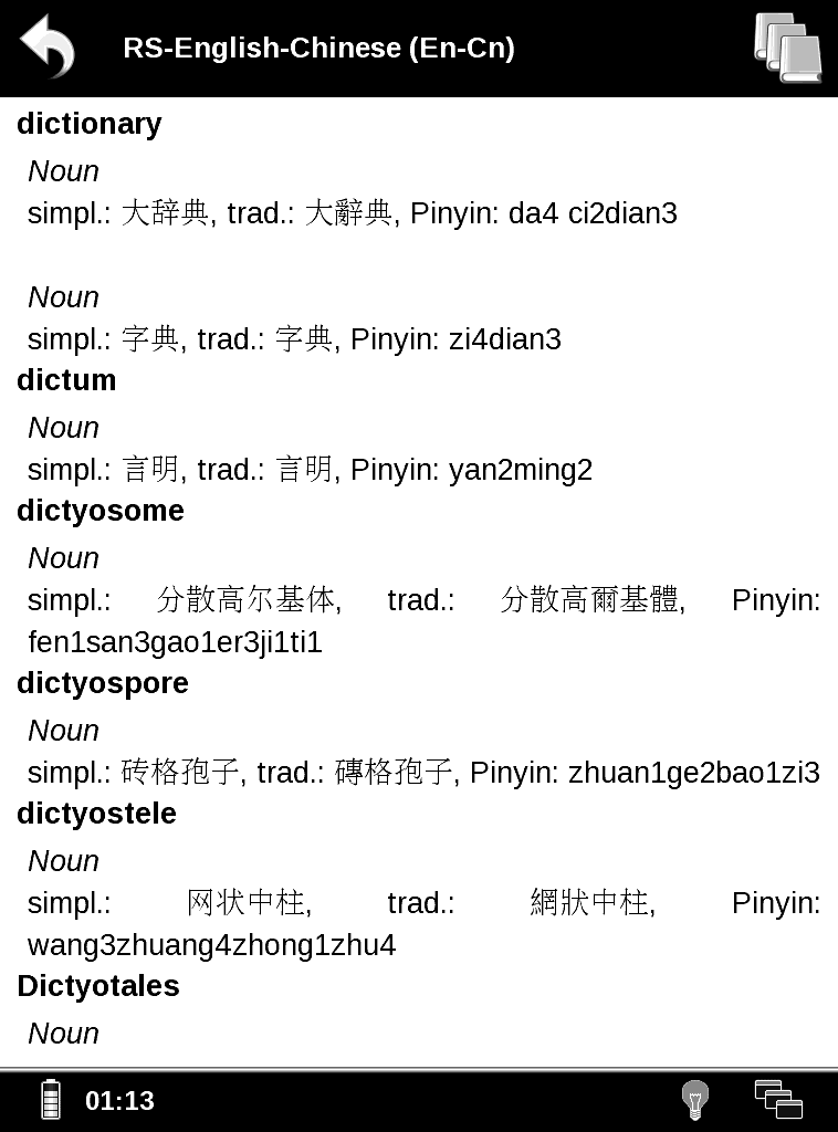 now you can also download the chinese (pinyin) to english dictionary. You can also use it to "translate" from pinyin to traditional and simple chinese. Feedback wanted! Regards Ronny |