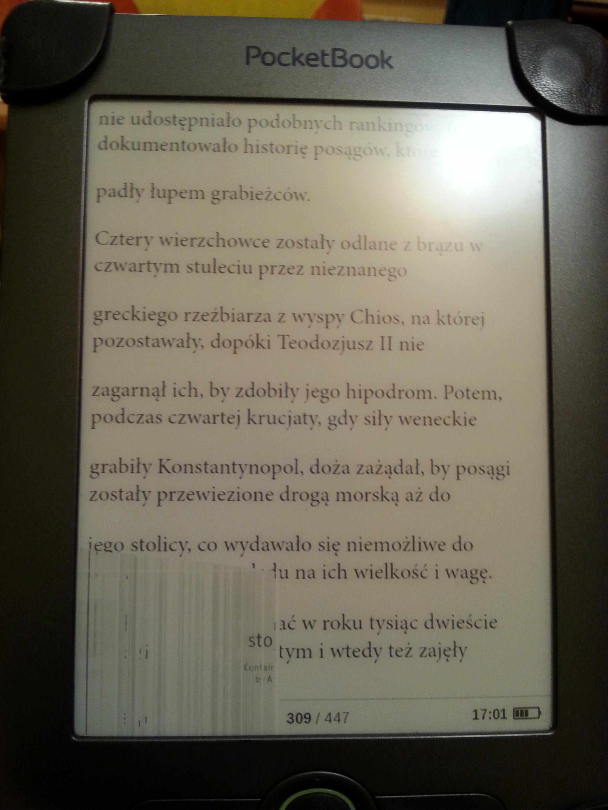 lately I noticed that sth happened to my PocketBook's screen. In the pictures below you can see waht happened. I have no idea what caused this damaged, maybe it was pushed too hard while being in my bag... Had anybody have similar situation? Can you tell me what happened and how can I repair it? |