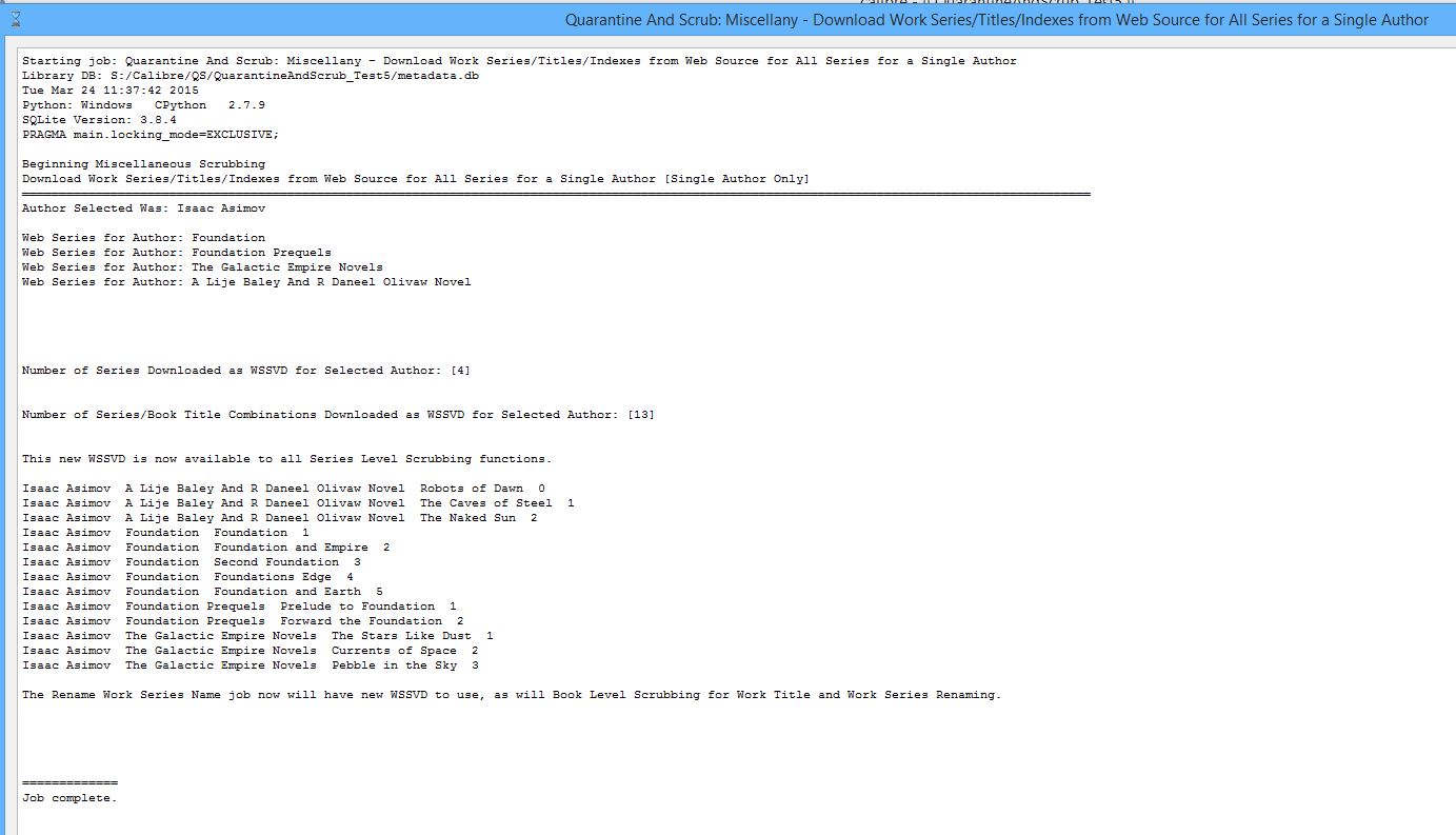 Attached is a little story made of images strung from top to bottom. The images were made from test data created by adding format-less "empty books" just now for this purpose with the Quarantine And Scrub add-on. Q&S does "Series-Level" scrubbing, including Series consolidation and renaming, as well as validation of Series and Index via a web source. There is a little "chicken and the egg" here. The "seed" is the example book that already had a valid Series. A validation of that Series took place, during which all 37 books within that Series were stored permanently within Q&S for future use. There is an image of that. When the "egg" (the book with no Series) was scrubbed by Q&S, it matched the Author and Title to known combinations stored permanently when the "seed" was validated against a web source. It then changed the Index accordingly. It can also change the Title to the correct Title if the Index is identical to what the web source said, and the % similarity that is calculated is high enough. The source of support and further information about Q&S is its User Guide and OP for the thread below. https://www.mobileread.com/forums/sho...d.php?t=247425 DaltonST |