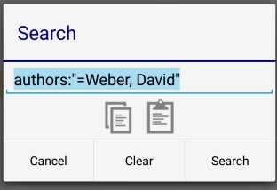 The search edit box will look like this: It is worth noting that CC's search string syntax is very close to but not the same as calibre's. The biggest difference is the placement of the leading " in match specifications. In calibre it looks like category:="value"; the leading quote is after the equals sign. In CC it looks like category:"=value"; the leading quote is before the equals sign. Because you use evernote and because they are so close, you could copy the searches from calibre to evernote on your desktop, make the small edits, then use them in CC by copying them from Android evernote to the clipboard. |