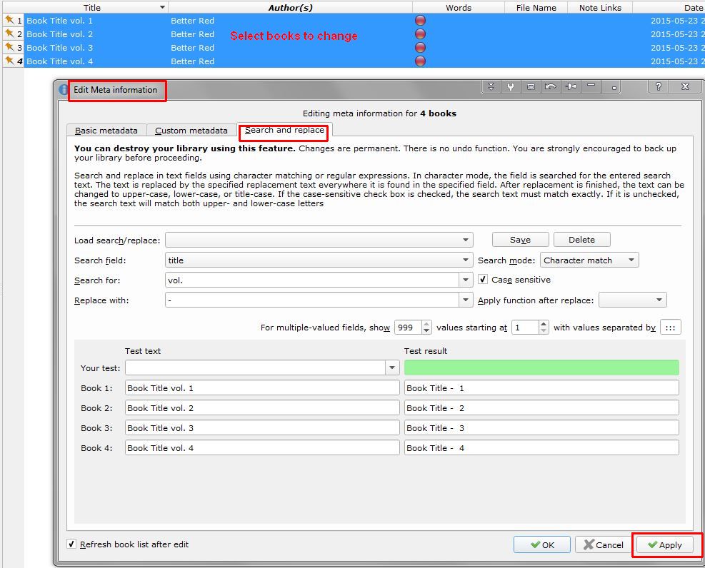 Suggest you backup your library first - bulk S&R especially on the Author and Title columns are potentially dangerous. BR |