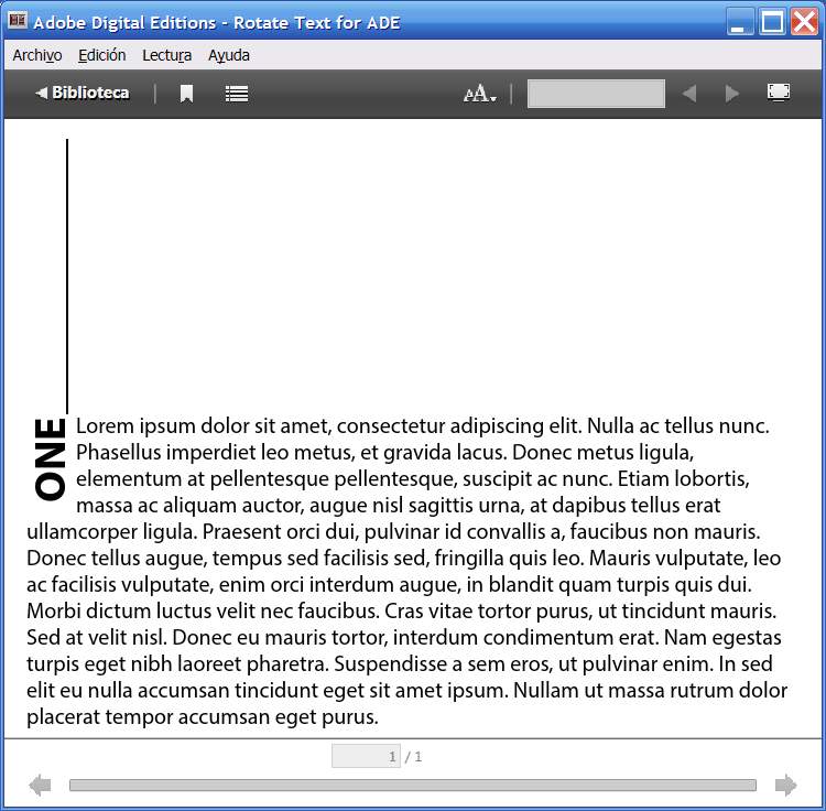 <h1> </h1> <p><span class="vertical">ONE</span>Lorem ipsum dolor sit amet, consectetur adipiscing elit. Nulla ac tellus nunc. Phasellus imperdiet leo metus, et gravida lacus. Donec metus ligula, elementum at pellentesque pellentesque, suscipit ac nunc. Etiam lobortis, massa ac aliquam auctor, augue nisl sagittis urna, at dapibus tellus erat ullamcorper ligula. Praesent orci dui, pulvinar id convallis a, faucibus non mauris. Donec tellus augue, tempus sed facilisis sed, fringilla quis leo.</p> The other way is to employ a float .svg image with the rotated text you want (in this case "ONE"). Of that way you'll be able to read the ebook even with ADE 2.x. This is how it looks in ADE with text as .svg image: You can watch the Rotated Text for ADE.epub I attach to see how to get that result. Regards Rubén Last edited by RbnJrg; 07-02-2015 at 12:42 PM. |