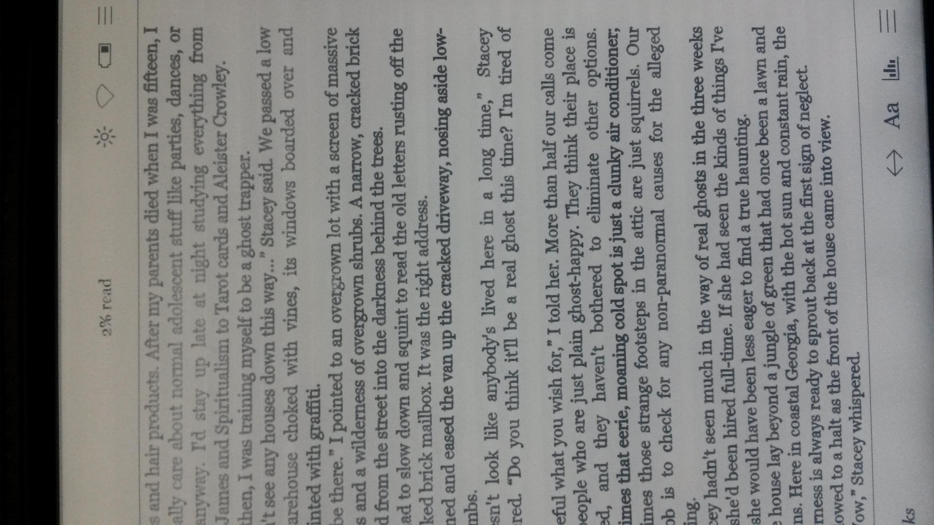 It's not unreadable, just disturbing and bothersome to me, enough so that I've retired it from active reading. The black lines are horizontal and occur a bit slower during the page turn, as if it's a lingering afterimage. Maybe that's the best description: A kind of afterimage. This is extremely hard to explain. I have my refresh rate to change with every page turn, by the way. (My Kobo Glo does not exhibit this; that's my go-to epub reader and genre reader. My Kindle Paperwhite is for Literary works.) ![]() ![]() I can only say that something is not quite right with my wonderful little 6.8 inch Kobo Aura HD. In going forward (or backward), the letters are sometimes degraded, most often occurring in the top half of the screen. If it's the video controller, is this a separate chip soldered onto the mother board? Is there a video cable, one that could have come partly loose? If you look closely, you can see the font degradation. The black, horizontal lines are barely visible [see second image], but extremely visible during the page turn. I guess part of my question involves whether or not this is a correctable solution, or if I should just toss it into the garbage (after stepping on it so that I can quickly take out the battery), so as to remove any fire hazard. Any help or advice is appreciated. Last edited by Dr. Drib; 08-17-2015 at 11:55 AM. |