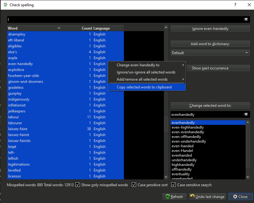 (For more info on \b, see Regular-Expressions.info: "Word Boundaries".) Anyway, to tackle the "l exclamation point" error, I would probably handle it this way: Finding Lowercase L Words In Calibre: Method A. Tools > Check Spelling. You can use whatever search criteria you need. ("Show only misspelled words", etc.) Then you can highlight all the words (Ctrl+A) + Right-Click > "Copy Selected Words to Clipboard": Method B. Tools > Reports > Words. Press the "Save" button in the bottom right. Then you can save a CSV file: From there, you can export to another program (like Notepad++ or LibreOffice Calc), where you can run regex or do more analysis. Side Note: I believe Sigil will be getting more CSV/export functionality in the future. ![]() * * * I ran Method A on a 130k word book: