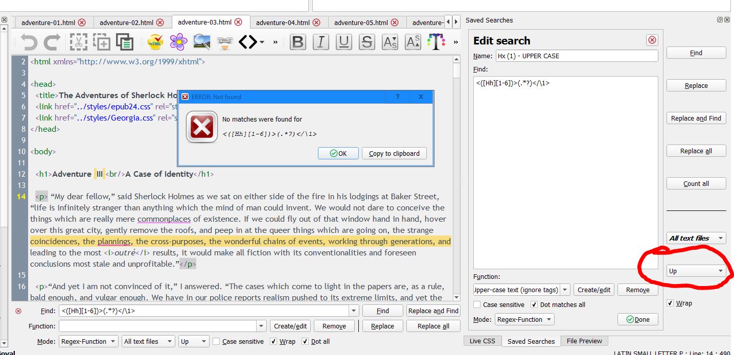 You either need to replace \1 with [hH][1-6] or use direction down.