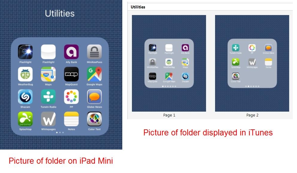Before iOS 9, an iPad Mini home screen "folder" displayed 9 apps per screen in a 3-row by 3-column configuration. With iOS 9, a folder now displays a more generous 16 apps in a 4x4 configuration. However, iTunes still shows the 3x3 configuration. The actual iPad displays 4x4 apps per folder, but iTunes displays only 3x3. The attached picture shows what I mean. Favor Request:If you have: - A golden oldie Vista 32-bit PC with iTunes 12.1.3 - An iPad Mini with iOS 9.0 or 9.0.1 or 9.0.2 - A home screen folder you have created - A sled named "Rosebud" ... this is optional ![]() If you are running iTunes 12.1.3 on a 32-bit PC, please let me know if you also have the 3x3 versus 4x4 display error. Thanks, Marty Last edited by MartyTX; 10-08-2015 at 10:57 PM. Reason: Asking about iTunes 12.1.3 32-bit version |