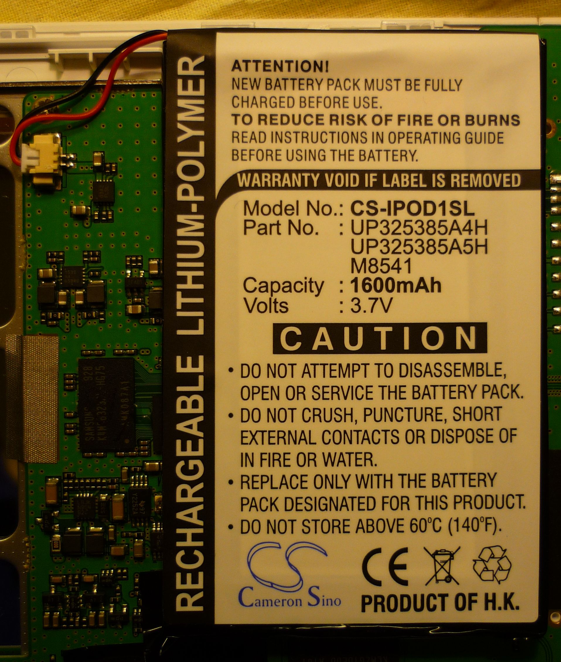 I replaced the battery successfully. I bought a new battery offered at ebay. It was declared to use for ipod 1. generation. (as mentioned above). The width and the lenght is a little bit bigger than the original, but at last its fit, after a little modification. Look at the data shield. (pic 1) But the best thing is: the plug fits perfect. (pic 2) I used some adhesive strips (double sided) to fix the new battery. (pic 3) The battery has to be mounted close to the plug. (pic 4) Because the new battery is a little bit longer, I removed the division bar from the rear cover. (pic 5) I hope this helps you like your hints were helpfull for me! - quit pro quo (H.L.) Keep on reading, Thomas |