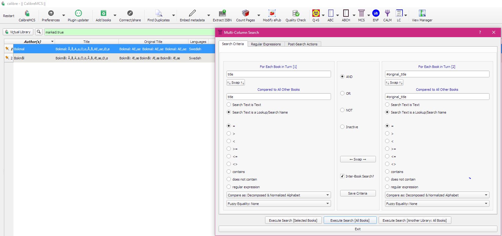I don't think group searches will help but that's a great tip anyway. I've nevere used this feature and for sure it will come in handy one day. (That's I love about Calibre - there is always something incredible to discover, and then I just wonder how it's possible I haven't seen it before )@DaltonST Thank you so much for your great plugin and your explanations! I installed the plugin some time ago but never figured out how it worked (kinda steep learning curve ). Yesterday I came up with the idea of trying it for my search (not a bad one, apparently ), and once again I failed miserably . And now it works, yay ![]() Two questions: - is it possible to perform an inter-book search in one column only? E.g. compare only #original_title (without comparing authors at the same time) or only authors (which would basically render a list of all books that have a non-unique original title/author). - is it possible to perform an inter-book search, comparing two different columns to each other? E.g. compare #original_title to title. (For the latter, I suppose I could use a workaround, creating a custom column that would feature the title if no original title has been entered, and searching in this column - but a direct search would be much more convenient) |