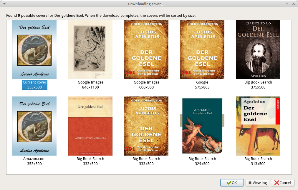 ![]() Edit metadata/Download cover from the same book (in partly very slightly different stages of processing or title/author names) found different results. What influences this cover search? As seems to indicate my experiments that is a mix of title and author. Furthermore I would like clarity. Title: Der goldene Esel Author: Apuleius von Madaura Title: Der goldene Esel Author: Apuleius Title: Der goldene Esel (GE)#orig Author: Apuleius von Madaura Title: Der goldene Esel Author: Apuleius von Madaura The last two books are 100% identical (original), except for the title. The results (cover selection) of the first and last book are identical, although the first is already edited, the last original. Obviously, the degree of editing does not matter. Last edited by chaot; 02-17-2016 at 09:04 AM. |