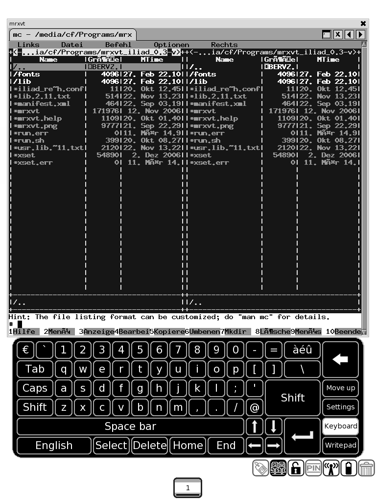 I attached a installation package. You can start mc in mrxvt with "mc" or "/usr/local/bin/startmc". Installation script has set a symbolic link via "ln -s /usr/local/bin/startmc /usr/bin/mc". mrxvt is included in the zip file. I have used the modded version in this post. If you use the matchbox keyboard most of the time, you should read this and use 0.4v instead, which includes Macros to emulate non-existing keys on iLiad's software keyboard. Contents of zip file: # mc.iLiad.0.1.install [mc installation package] # mrxvt_iliad_0.3.1 [shell terminal mrxvt] # doc [mc FAQ, man pages] # mc 4.6.1 iLiad 0.1.png [screenshot] # Readme.txt [this file] [EDIT II 03/12/2008] #I have downloaded an unofficial mc src code mc-4.6.2.pre1-1.2.src.rpm with dozens of patch files, which UTF-8 patch file to choose? ![]() Maybe compiling this will solve problem with non standard characters, as described below. # I changed attached zip file [mpc*.zip != mc*.zip; added some lines in Readme.txt]. Quote: