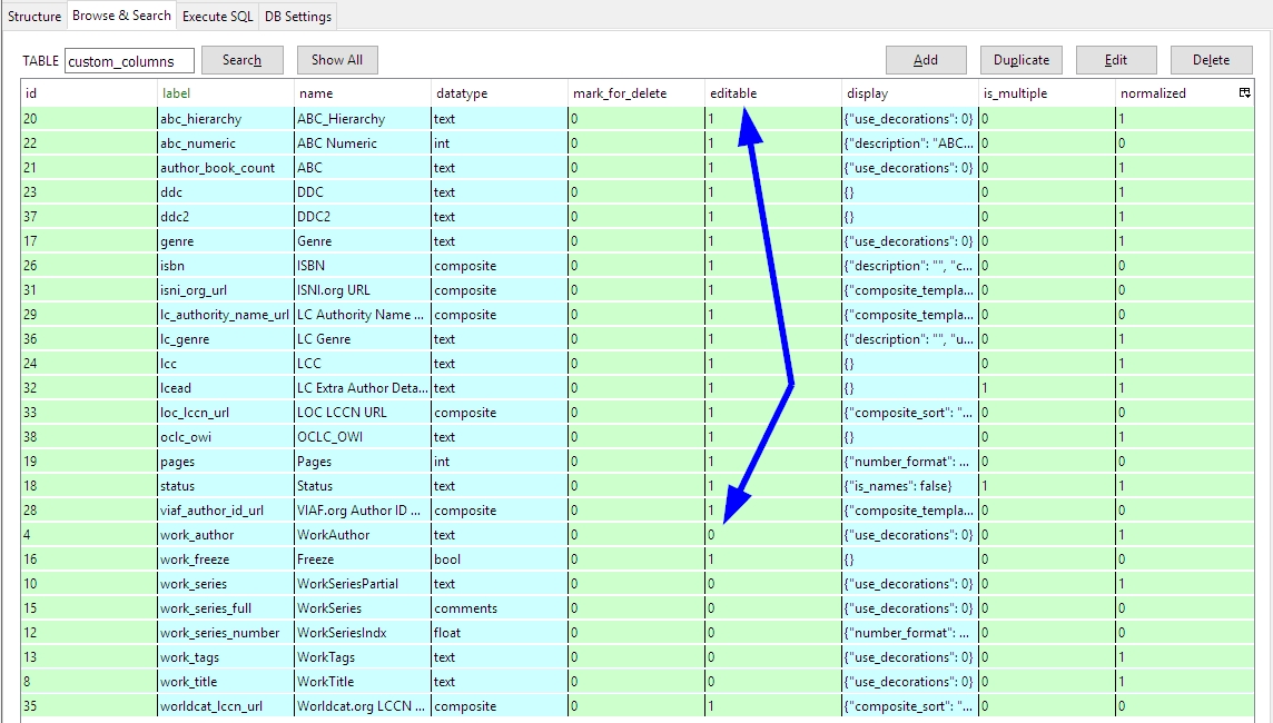 For Custom Columns, of course. Easy. Simply change table custom_columns in metadata.db for the specific Custom Column you wish to protect. Do this while Calibre is not running. See the attached example. If you need a tool to do the edit, download the 'DB Browser for SQLite' tool from http://sqlitebrowser.org/ Needless to say, be careful what you touch in metadata.db. If appropriate, practice first on a test library. Also, close the tool before running Calibre. DaltonST Last edited by DaltonST; 04-17-2016 at 05:12 PM. |