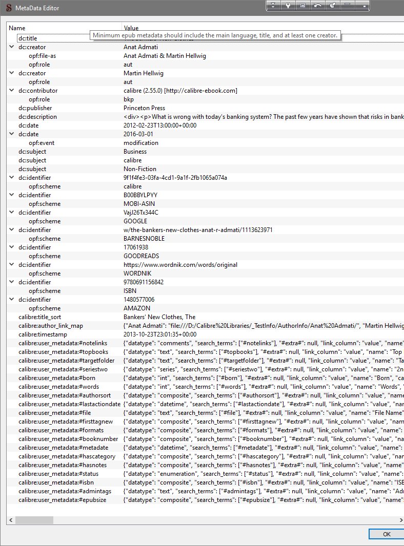 I'm talking about the <dc:identifier opf:scheme="MOBI-ASIN">; <dc:identifier opf:scheme="calibre">; <meta content="2016-05-05T17:15:37.835000+00:00" name="calibre:timestamp" />; <dc:date>2016-05-03T07:00:00+00:00</dc:date>; name="calibre:title_sort" />; <dc:contributor opf:role="bkp">calibre (2.56.0) [http://calibre-ebook.com]</dc:contributor>; this stuff when you get books from other people. Windows 10; 64 system.