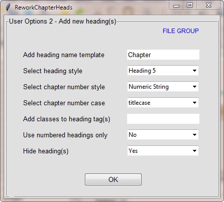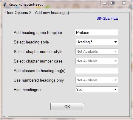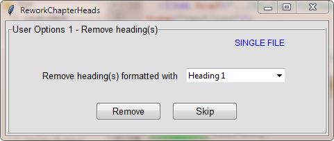 Automatically replaces or adds selected file headings or a single selected file heading in multiple user-defined formats and styles RequirementsPlugin Type: Edit MIT Licence(OSI) Minimum Sigil requirement: v0.9.3 or higher Python Requirements: Python 3.4+ (Bundled or External) OS Requirements: Windows, OSX or Linux *** Tested on Windows 7, 8 & 10, OSX and Linux *** Current Version: "0.2.2" Installation * Select Manage Plugins from the Plugins menu. In the dialog box, select either the Bundled Python or the External Python(Python 3.4+ should be installed on your computer to run this plugin externally). * Click Add Plugin and select ReworkChapterHeads_vXXX.zip. This will load and install the plugin into Sigil, which you can then select and run using Plugins > Edit > ReworkChapterHeads Description This plugin tries to provide an easy and quick way of replacing or adding either multi-file headings or a single file heading in your epub 2 or epub 3 file(added in v0.2.2.) that will be formatted according to the user's own individual styling preferences. The plugin allows the user to do the following: * Remove and/or add heading(s) * Add or change the heading text name * Add or change heading styles * Change the heading number style to numeric string, number as text or roman numerals * Change the heading number case to titlecase, uppercase or lowercase * Add classes to heading tag(s) * Create numbered headings only * Hide heading(s) This plugin automatically inserts all selected file group number types consecutively in various user-defined formats and styles using normal file selection from Sigil's Book Browser(See Plugin Run for details). User Options 1 -- Remove heading(s) (via dialog) * Remove heading(s) formatted with... This option allows the user to initially select and remove all selected heading lines in the epub or a single selected single heading line that is formatted in h1 to h6 heading style. If the Remove button is pressed the appropriate heading lines from the selected files will all be removed. But if the Skip button is pressed then this dialog will do nothing and the plugin will continue. So if you are replacing your heading(s) you should select the relevant heading style and use the Remove button but if you are adding new heading(s) then you should just use the Skip button(no headings will be removed). This remove/add feature is quite flexible and can also be used in other ways e.g. like removing the current h1 chapter headings in an epub and perhaps replacing them with formatted and styled h2 chapter headings. User Options 2 -- Add new heading(s)(via dialog) * Add heading name template This option allows the user to type and add the heading name part of the new heading into the textbox either in title case, lower case or upper case i.e. whatever you type into the textbox will be used as the main heading name throughout. * Select heading style Now allows a choice of h1 to h6 heading style for all newly generated headings(changed in v0.1.6). * Select chapter number style Allows the user to select the chapter or part numbering style e.g. numeric string, number as text or roman numerals. * Select chapter number case This option only works if you have previously chosen Select chapter number style > Number as Text. Available user choices: titlecase, uppercase or lowercase. Chapter number as text case examples: one, Ten and TWENTY-THREE. * Add classes to heading tag(s) The user just types a class name into the textbox for that class to be included in all the newly generated chapter heading tags. Also make sure that the class has already been properly defined in the css. If you need to add more than one class per chapter heading, then just add in each class separated by a comma or a space. * Use numbered headings only(added in v0.1.4) Allows the user to just use numbered headings for all chapter or part headings e.g. 1, 2, 3 or ONE, TWO, THREE or I, II, III. If Number as Text is selected, the text will always display in upper case whenever numbered headings is selected. * Hide heading(s) This feature is particularly useful if you are using jpeg images as chapter headings throughout your epub. By selecting and tagging the same pages containing these heading images using this plugin feature, these new chapter headings will remain invisible in Text View but they will still be present in HTML View, so this should help to make those chapter heading images both linkable and searchable in your epub. Caveat The new maximum number of chapters allowed when using the Number as Text or Roman Numerals dialog options has been increased to 100 (added in v0.1.7). Otherwise you'll get overrun errors. Depending on whether you use h1 to h6 heading styles, be sure that the chosen heading style for your heading is already properly defined by you in the css, otherwise the default heading style will be used. This plugin does not add or change styling in the css. Plugin Run * Using Ctl-Click and Shift-Click with your mouse, select either a single file or a multi-file group from Sigil's Book Browser. * Then just run the plugin and the chapter heading(s) will automatically be replaced or added and formatted according to your dialog choices. * Also bear in mind, for all chapter file group selections, that this plugin does not automatically update the epub TOC file or the Logical TOC(toc.ncx) to your new chapter heading style, so you should perhaps also run Create TOC and Generate TOC in Sigil to match up all ebook/device displays after running this plugin. This plugin can now add, replace or modify both selected file groups as well as modify a single heading from a selected xhtml file(added in v0.1.6). Plugin users should now be able to use single file selection to add or replace the main heading from any selected epub xhtml file e.g. any chapter heading, TOC file, Title, Introduction, Preface, About the Author etc. Changes Spoiler: