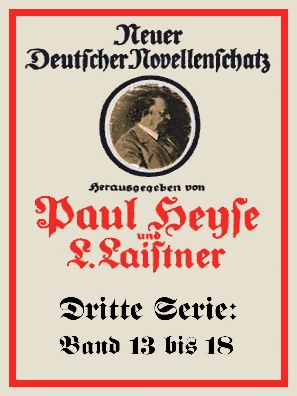 Seit 1871 gab Paul Heyse gemeinsam mit Hermann Kurz die Reihe "Deutscher Novellenschatz" (1871–1875, 24 Bände) im R. Oldenbourg Verlag heraus. Es folgte der "Novellenschatz des Auslandes" (1872–1874, 14 Bände) sowie der "Neue Deutsche Novellenschatz" (1884–1887, 24 Bände), herausgegeben von Paul Heyse und Ludwig Laistner. Zahlreiche noch heute bekannte Novellen erschienen hier. (nach Wikipedia) Neuer Deutscher Novellenschatz - Dritte Serie. Bände 13 bis 18. Erschienen im R. Oldenbourg Verlag, München. 1886. III. Serie: (1886) Inhalt des XIII. Bandes. Herr im Hause. Von Margarethe von Bülow. Das Opfer. Von Gottfried Böhm. Gustav Adolf's Page. Von Conrad Ferdinand Meyer. Inhalt des XIV. Bandes. Ein Doppelleben. Von Josef Viktor Widmann. Eine schwarze Kugel. Von Amélie Godin (Amélie Linz). Die Danaide. Ernst von Wildenbruch. Inhalt des XV. Bandes. Rosi Zürfluh. Von Johannes Scherr. Trudel's Ball. Von Hans von Hopfen. Inhalt des XVI. Bandes. Frau Antje. Von Adalbert Meinhardt. Elysium in Leipzig. Von Wolfgang Kirchbach. D' Stadtjompfer. Von Richard Weitbrecht. In Folge einer Wette. Von Paul Lindau. Inhalt des XVII. Bandes. Was wird sie thun? Katharina Von Zitelmann. Die Dorfkokotte. Friedrich Spielhagen. Inhalt des XVIII. Bandes Die Volskerin. Von Gustav Flörke. Aquis submersus. Von Theodor Storm. This work is assumed to be in the Life+70 public domain OR the copyright holder has given specific permission for distribution. Copyright laws differ throughout the world, and it may still be under copyright in some countries. Before downloading, please check your country's copyright laws. If the book is under copyright in your country, do not download or redistribute this work.