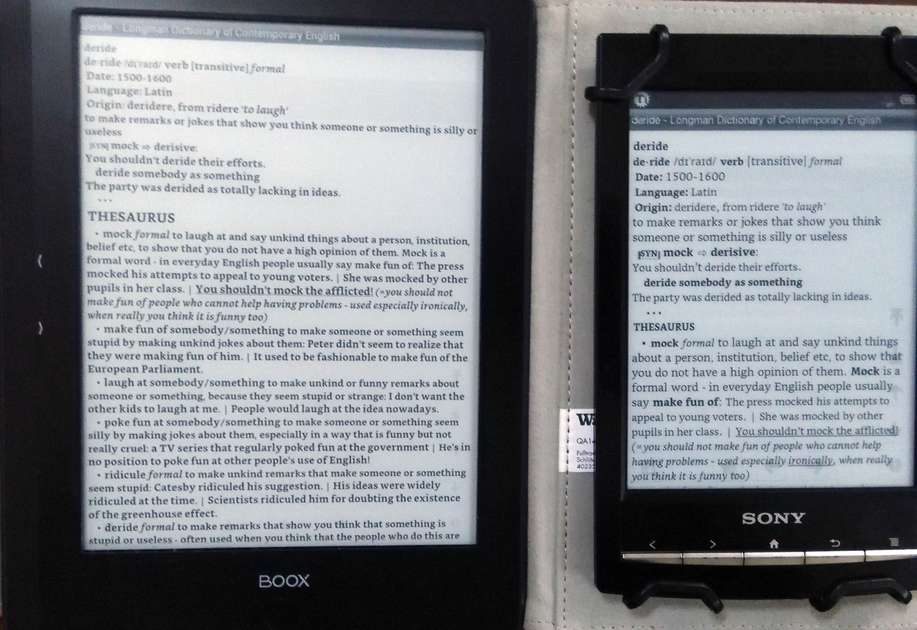 I was on a trip and took with with me my "old" Sony PRS-T1 Reader for some casual reading. After getting back home, I switched to my I86+ and immediately noticed a real difference in the display. Mind you, the I86+ is supposed to have resolution. Take a look at the attached images. I am running the same app with the same css, fonts, everything. You can notice that there is an unambiguous difference between texts that are bold, italic from those that are regular on the PRS-T1. This is not so the case with the I86+. The PRS-T1 display is much pleasing. |