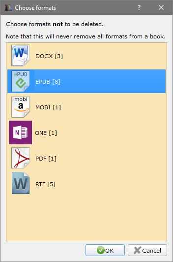 Are you sure you used the Remove books->Remove all formats form selected books, except option, would have looked something like this I always use the other option, and select the formats I do want to delete. Is your library on Dropbox or something similar ? Or are you running Time Machine or some other continuous synch/backup software such as RealTime Synch BR Last edited by BetterRed; 07-01-2016 at 06:55 AM. |