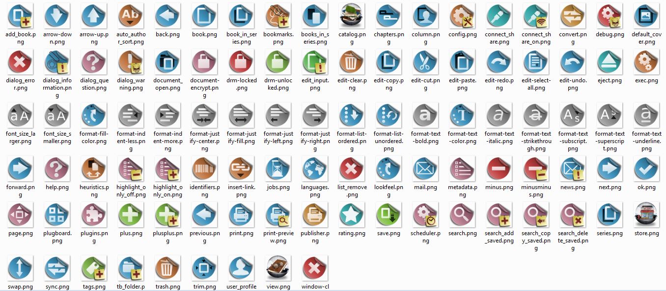 Gnome-friendly icon set. This is the partial set that inspired Kovid to add the user customization of icons feature. Quote: