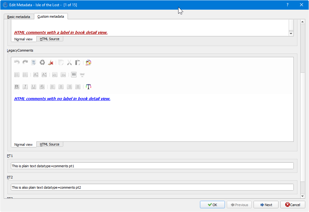 The end result of that thread is simply: There will be no new datatypes at all. "Calibre Companion" and all of the other 3d party software that interacts with Calibre might crash and burn if there were a new datatype. Kovid and Chaley agreed that instead of adding the new datatype that I proposed, the current datatype of "comments" (long-text not shown in the tag browser) will be enhanced to have a checkmark in Preferences > Add Your Own Columns that says "plain text", and another that says "show with label in book detail view". As you know, comments do not currently appear in the book detail view with any labels. The intention is to make the datatype of comments be both long-text and short-text depending on the user's checkmarks in the new checkboxes when a custom column of that datatype is first created. So, "comments" will become "text not shown in the tag browser". The type of text (html or plain) will be up to the user. DaltonST Last edited by DaltonST; 07-19-2016 at 07:06 PM. Reason: fix typos |