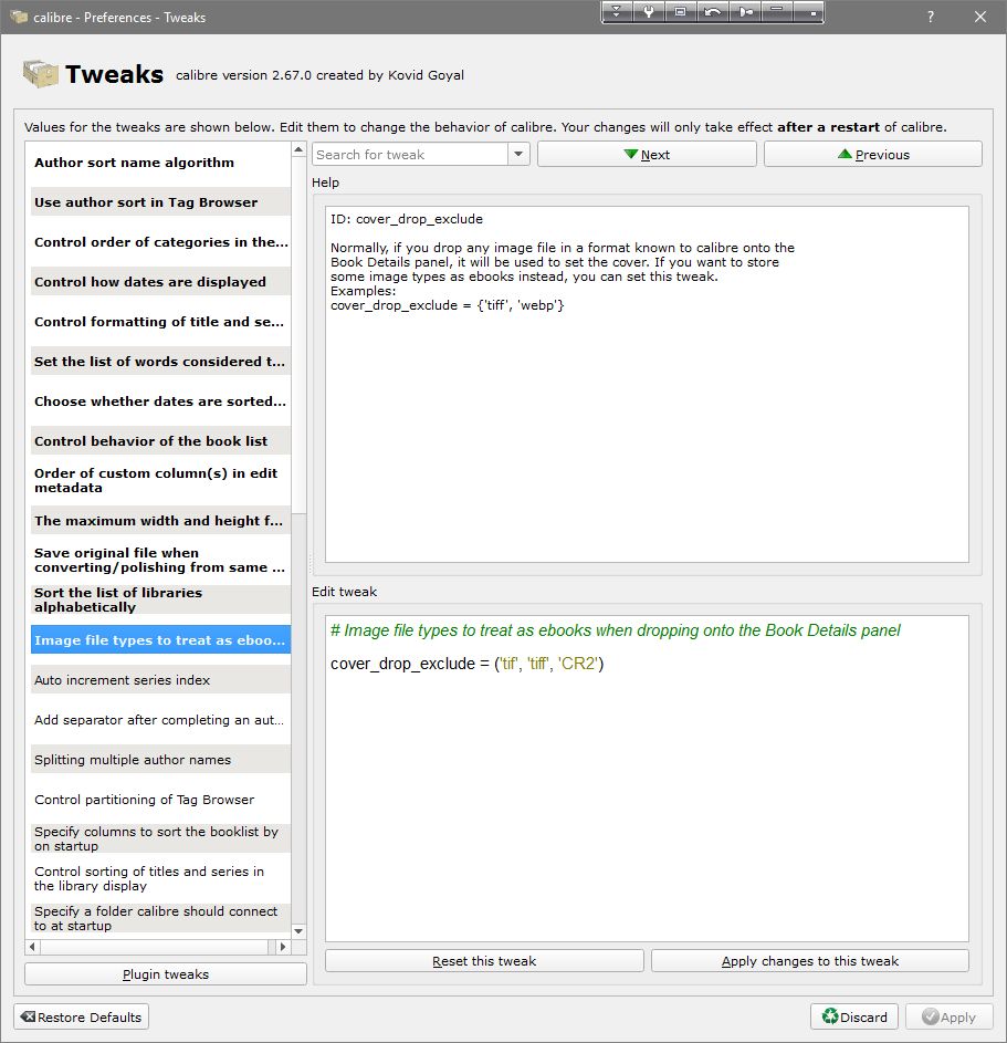 Allow reading more image formats as covers Add a tweak in Preferences-Tweaks to exclude some images types The githib entries have links to the relevant launchpad requests. I moved your thread, as I didn't want others thinking the change was related to the Editor. The launchpad tickets referenced in the What's New entries are a good source of background information (i.e. the why) about changes. See ==>> Upcoming change BR Last edited by BetterRed; 09-09-2016 at 07:16 PM. |