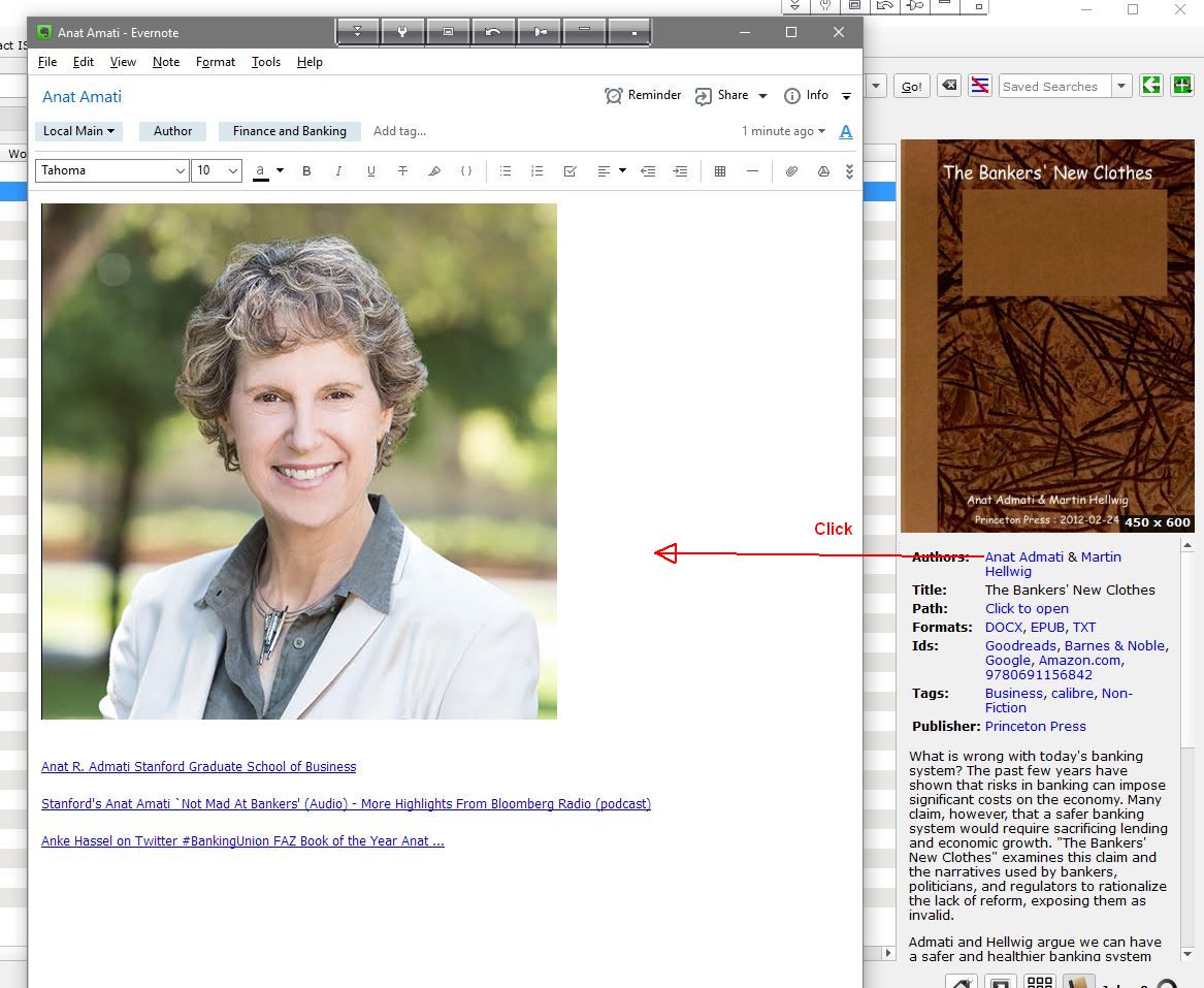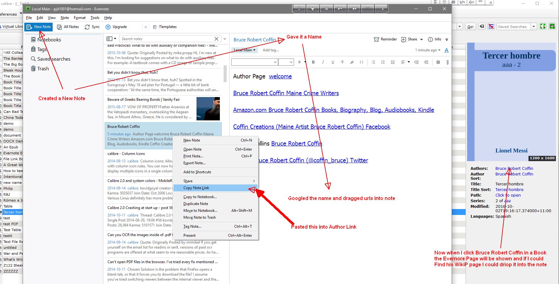 If you don't put anything in Author Link then clicking on an author name in the book details side bar will use the link at the top of Preferences->Look and Feel->Book Details, which by default is set to search Wikipedia with authors name. To make it search Google see ==>> Switch author search from Wikipedia to Google? But, if you put a link into an Author Link, such as a facebook page web address, you override the link in Book Details. The way around this is to put a link to something that can contain multiple links - and put the facebook, Wikipedia, Twitter, Weibo etc links in there. And IMO the simplest way to do that is to use an off-the-shelf product such as Evernote or Onenote. EN and ON Notes can have multiple links/pictures/text/tables etc, and most importantly EN and ON provide the means to access a Note from other applications (such as calibre) via application specific protocols. In practise that's right click a Note, select Copy Note Link, then paste what's in the clipboard into a calibre Author Link field. No plug-ins, add-ons, custom columns etc - vanilla off-the-shelf. And as a bonus you can access your EN Author notes on an Android device by tapping on the Author Name in Calibre Companion. An IOS version of Calibre Companion is on its way. BR Last edited by BetterRed; 10-02-2016 at 06:05 PM. |