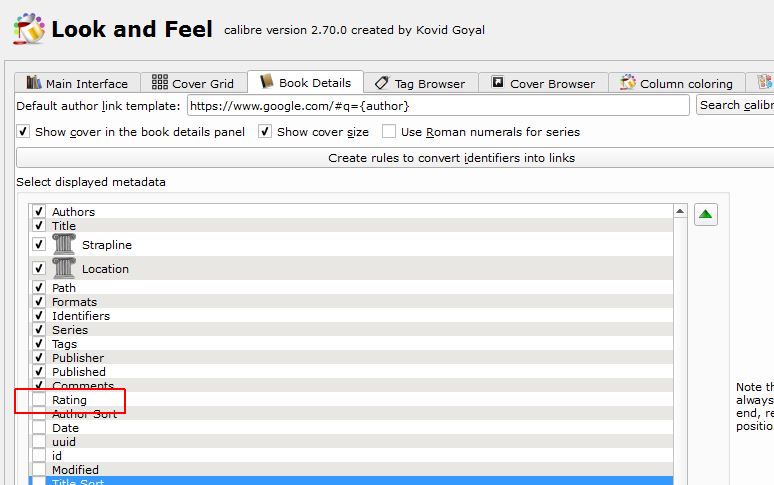 In Preferences: Look and Feel: Book Details: ......ratings is not ticked. Regarding the Metadata editor Not sure where it is. Is it the clip I uploaded? If so its not there. Thanks for being patient lol. |