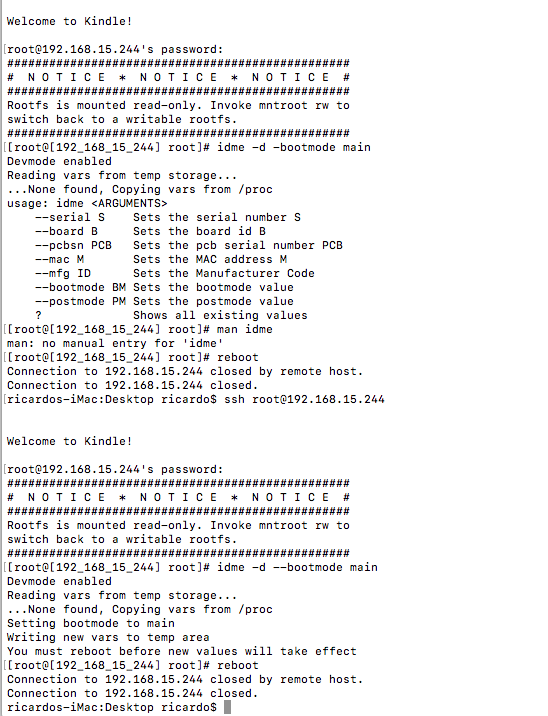 However, after doing what it said, the Kindle still goes back to System Diags, I'm not sure if I have to mount some filesystem. Better ask before messing something up. This is the ssh session, if there is some useful information: |