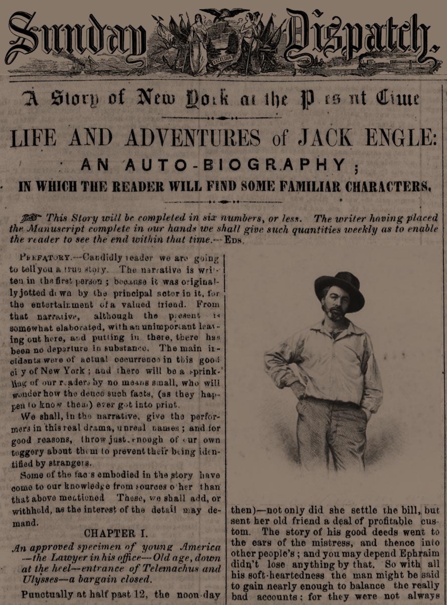 Here’s the recently discovered short novel “Life and Adventures of Jack Engle: An Auto-Biography” by Walt Whitman (1819–1892, Wikipedia), which was first published, from March 14 to April 18, 1952, in Manhattan’s Sunday Dispatch newspaper. The original text was riddled with typographical errors. No effort was made to correct them. Best regards, pynch. This work is assumed to be in the Life+70 public domain OR the copyright holder has given specific permission for distribution. Copyright laws differ throughout the world, and it may still be under copyright in some countries. Before downloading, please check your country's copyright laws. If the book is under copyright in your country, do not download or redistribute this work.