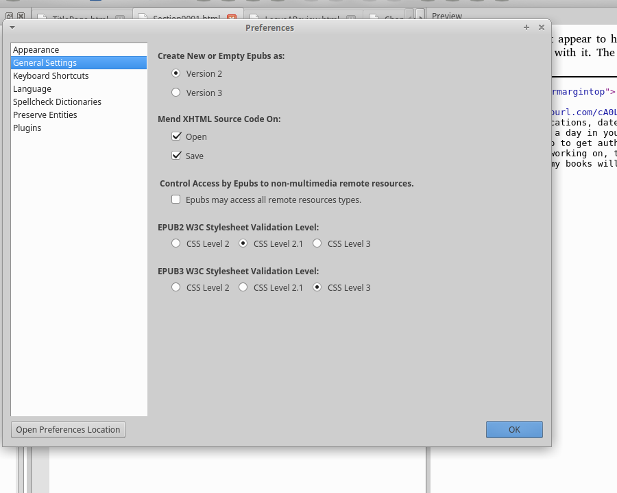 So that was the exact screen I got. I tried to X out of the window. I clicked on a few more things to test the funtionality but the screen was froze. I would say about twenty seconds later Sigil crashed and I got the window asking me if I wanted to re-launch Sigil, which I chose. Then I got the window saying that specific file I'd been working on couldln't be found. So I looked for the file. I had two copies of it but only one that I had done the great majority of work on. I opened it and it was missing the great majority of the work. Like I said, I thought I'd missed something and checked the other file. Same thing. Missing the majority of the work. I did a file search to see if there happened to be more than two copies. There wasn't. It seemed absolutely impossible that that could have happened but that's what happened. And yeah Mend is on Open and Save. (screenshot) I kept working with the same file and it saved properly. (I of course also saved it somewhere else.) |
