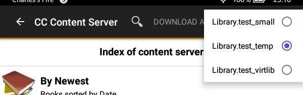Sorry, but I don't understand what you are telling me.  If on my test system I tap "Change Library" then I see the following: I can then tap the library I want, in this case the second one, in which case the library changes. After I do that then I see the following: and I am looking at the books in the second library, exactly as I expect. What exactly are you seeing? If you are saying that you are not seeing all the libraries on your computer then the answer is "you are seeing all the libraries that calibre knows about." CC asks calibre for the list of libraries. Calibre gives back to CC the libraries that are on the calibre "quick switch" menu. There is nothing that CC can do about that. Instead, you mist be sure that the running instance of calibre has all the libraries of interest in its library change menu. As for discrimination, CC uses what calibre gives it. Calibre does not like path names with non-ascii characters in it, and never has. Again, there isn't anything that CC can do about this. |