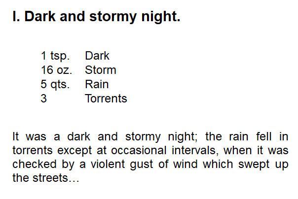 <p>It was a dark and stormy night; the rain fell in torrents except at occasional intervals, when it was checked by a violent gust of wind which swept up the streets…</p>
