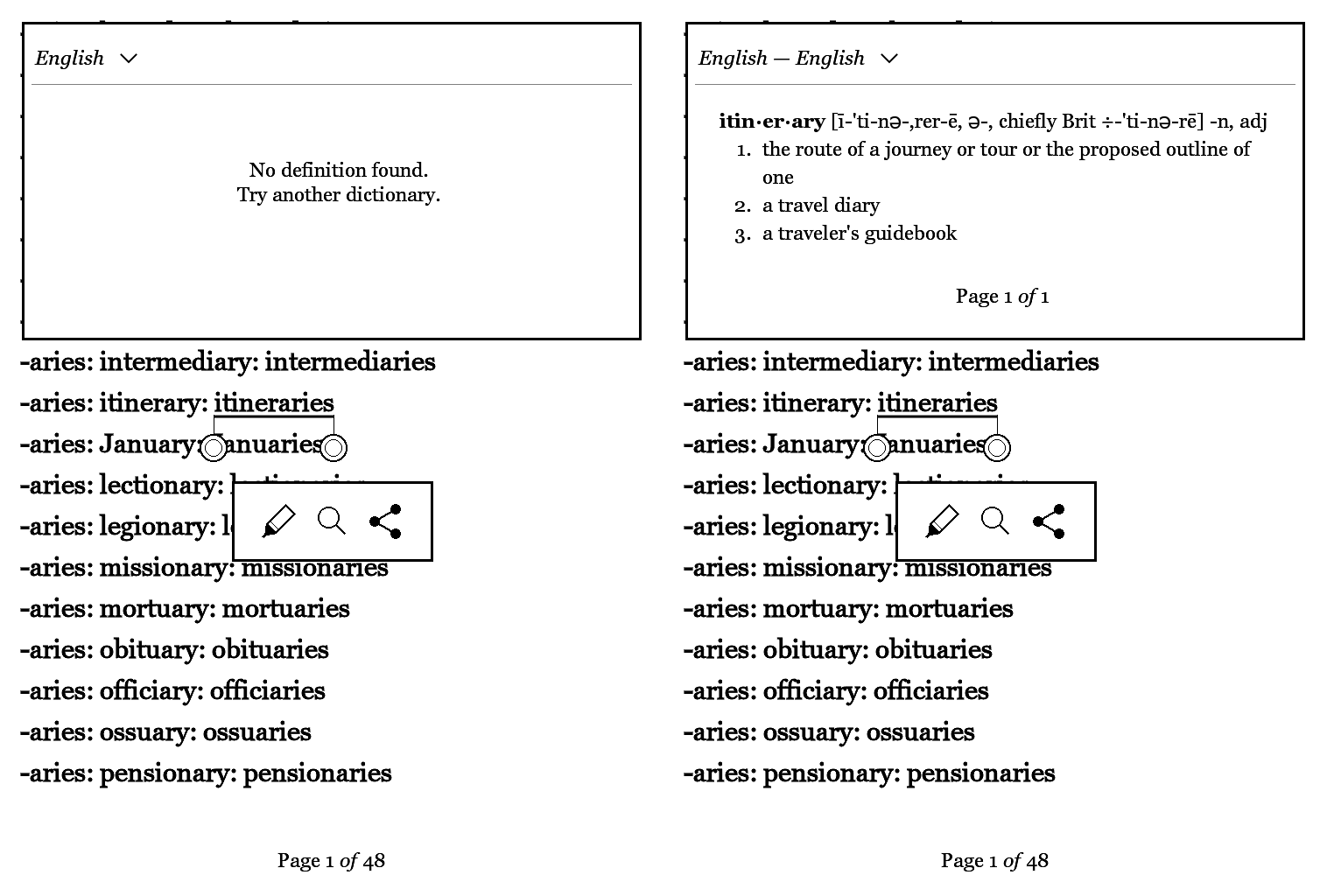 I would like to mention that the performance of the English definitions dictionary (and presumably also of other dictionaries) could easily be improved by making better use of the variants that are recorded in the dictionary. Currently, variants seem not to be taken into consideration, when they are available only in abbreviated form, like "-aries" in the case of "boundary". To check this, I went through the dictionary and resolved the abbreviated variants. I add some images for illustration.