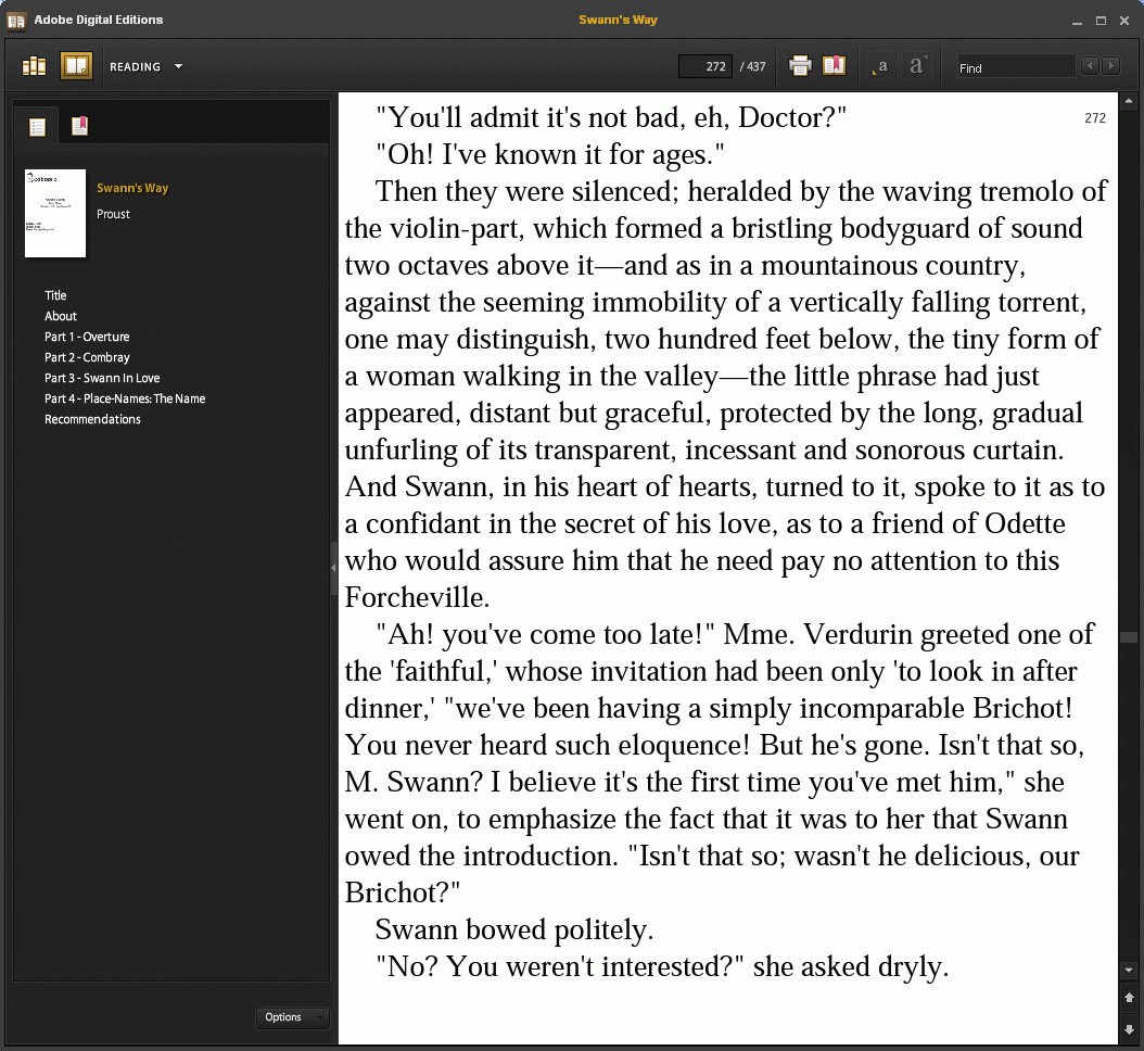 For most authors, Adobe DE's requirement (for the Sony and, eventually, other handheld devices) of < 300 KB per ePub XML file is easily met by using one file per chapter. Feedbooks has been using this approach for some time now. However, Proust is one of the authors where this isn't sufficient. In the case of Swann's Way, for example, Part 3 is 508 KB.