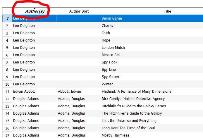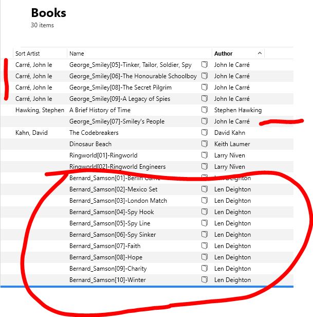 The book info on the iPad was not editable so as an experiment I cleared the "Author Sort" field metadata, saved the ePubs and exported using calibredb. The 10 Bernard Sampson books by Len Deighton now all sort properly where as before 5 or 6 had a 'Sort Artist" of Deighton, Len and were with the rest of the D's Is there something (a PI, editor, something) to make this a little easier? I can bulk edit the metadata if I have to, but would rather not since Calibre seems to use the Author Sort even I tell it to use the Author field (Calibre Sort.jpg) BTW, I'm not a very good Apple user (or fan) but the iPad was a gift and it's been a struggle so far