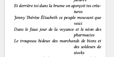 Each verse has its own paragraph style (Chanson) and the stanza is kept within a div (space) tag. As the length of the verses is variable, I could not find a perfect solution and had to compromise. I tried this one on a six inches screen, it should possibly be better on wider ones, and dubious on smartphones. I made use of a negative indent which seems to be correctly supported for ePub and PDF. A screenshot is joined. No idea for others (hello Hitch!). Code: