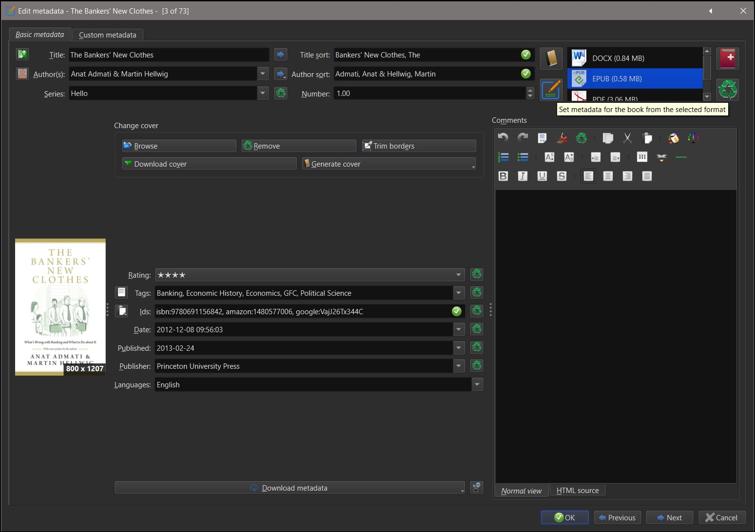 I haven't used Calibre in ages but am trying to organize my epub files in the library. I dragged and dropped them in, and it shows the name, cover, etc. However, most of the books don't show their Series info even though they're almost all part of trilogies or other series. I tried doing the Ctrl+D download and checking all the source boxes. That brought in one or two more series but still half the books don't show one. Is there any better way to parse that information somehow so I can use the Series info to sort/group my books? Also, is there any way to use a field for the overall grouping of books from the same world? E.g. Could I put "Lord of the Rings" in a field and then put the Hobbit, fellowship, two towers, return of the king, Silmarillion, Could I put "Drgonlance" in a field and then have all the series from Dragonlance be grouped together? Thanks. |