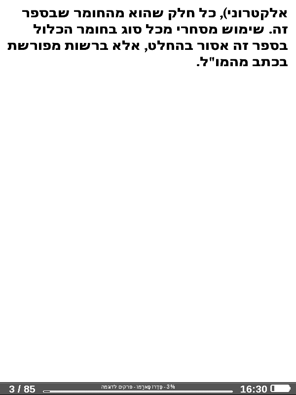 Finally, the Hebrew eBook market shows some signs of awakening. Unfortunately, not all reading systems (eReader devices and applications) support Hebrew properly. Hebrew is a Right To Left (RTL) language (like Arabic) and therefore needs a little different treatment. I would like to post in this thread the current status of Hebrew support among various eReaders, reading applications and platforms. I'll try to update it from time to time. If you have a device that is not listed here, you are welcome to check and post the results. My main focus is on the ePub format. However, I also tested Kindle with mobi ebook... Sample Hebrew ePub is attached here as well as a few screen captures of the expected results as seen with Calibre. In addition, any test results for applications and devices listed here are linked to the appropriate post in this thread. Just the latest and up to date result is linked. eReader Devices and applications that support Hebrew Dedicated e-ink eReaders: 1) Amazon Kindle (3rd generation and above) - kneidlach site 2) PocketBook devices (using FBreader) - Test Results 3) eVrit - a dedicated Hebrew eReader based on Qisda QD060B00 4) PAGEone by Next Papyrus - a Korean eReader, possibly with a firmware update for the Israeli market - Test results. 5) Rooted Nook Simple Touch with Android reading app that supports Hebrew. 6) Rooted Sony PRS-T1 with Android reading app that supports Hebrew. - See details 7) Onyx Boox X61S (using FBReader) with a dedicated (Polish) firmware - Test results 8) Spring Design Alex (possibly with a firmware update by Newpan for the Israeli market ). Tablets and smartphones: 1) iPad, iPhone, iPod (using Stanza or iBooks) - Test results 2) Samsung Galaxy Tab, Motorola XOOM and any other Android Tablet using a capable reading application. Applications: 1) EPUBReader add on for Firefox 2) Calibre (On PC or Mac) 3) FBReader (On PC) 4) AZARDI 6 (On PC, Mac and Linux) - Test Results 5) Aldiko for Android up to Version 1.2 only!!! - Test results 6) Moon+ Reader for Android - Test results 7) OverDrive Media Console (On iOS, Android and Blackberry) 8) Blio Reader for Android. 9) Kobo Reader for Android. 10) Readium extension for Chrome - Test results 11) eBook Reader widget for Opera 12) Bookworm 13) BookGlutton eReader Devices and applications that doesn't support Hebrew ![]() 1) Adobe Digital Editions - Test results 2) Sony Readers - Test results 3) Nook Readers - Test results 4) Kobo Readers - Test results 5) FBReaderJ for Android - Test results 6) Kindle (before the third generation while using valid Hebrew mobi file) 7) BeBook - Test results 8) Foxit eSlick 9) Freda for Windows Mobile 10) iRex 11) JetBook 12) Alex 13) CyBook by Bookeen 14) Aluratek eReaders 15) Aldiko version 2 Below are sample screen captures of valid Hebrew display of the attached ePub: TZR-PedroParamo.epub TZR-PedroParamo.epub Last edited by carmelra; 05-13-2013 at 04:43 PM. Reason: Kindle Hebrew support officially added. |