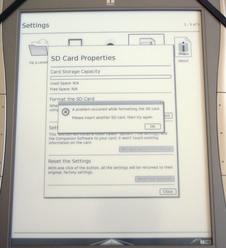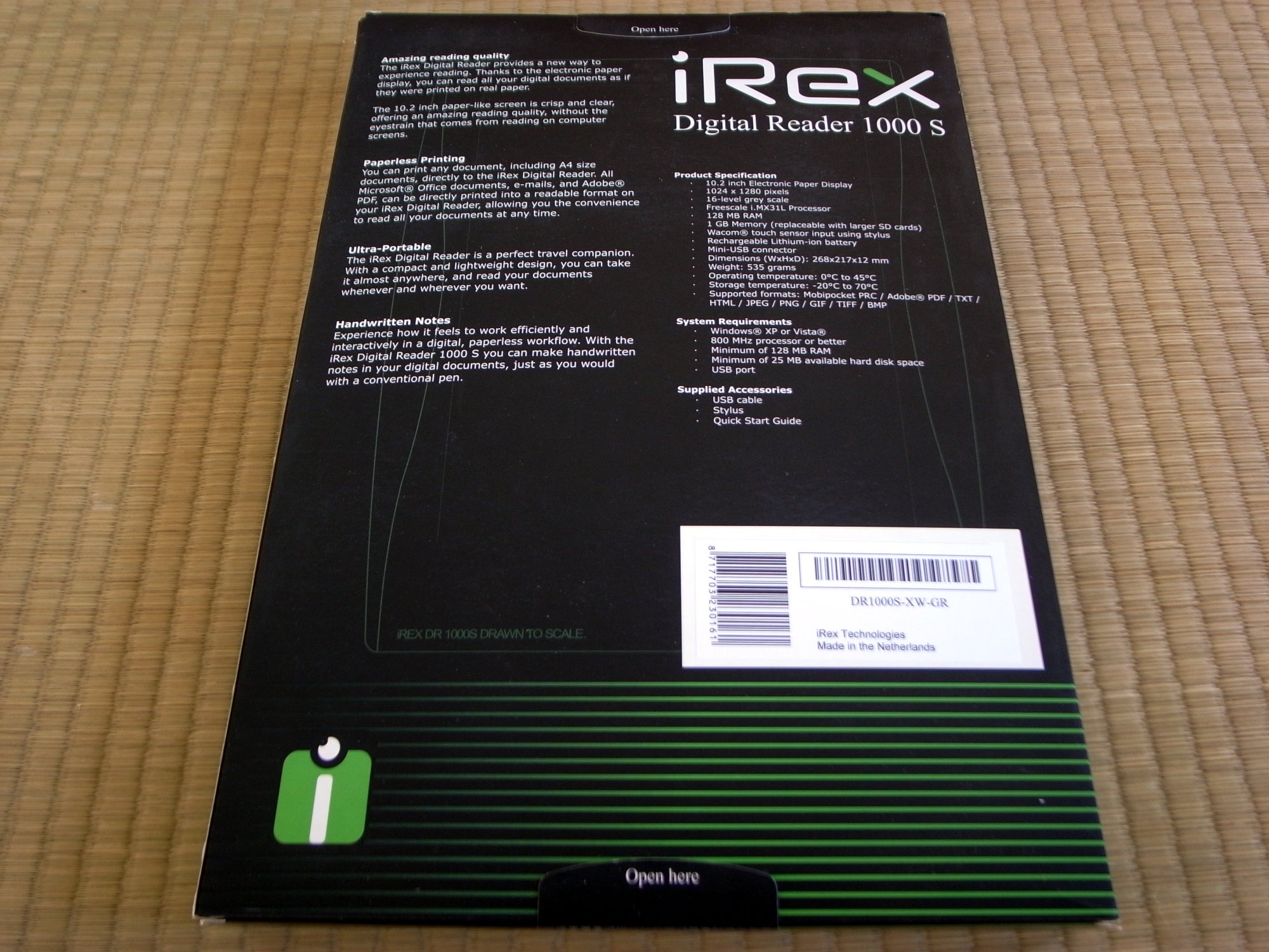 I ordered the DR1000S and Deluxe cover from eReader Outfitters and the accessories from iRex directly. Through some coincidence, they arrived together (good thing, since the Deluxe cover is not available... yet) If the DR1000S is big, the (cardboard) box is gianormous ^_^; It came with a "Reader 101" sticker covering the screen, and still had enough charge left for me to play around with. It's certainly the snappiest e-ink reader I have used, esp. with PDFs (not that I have any love for that format, on the Sony the newly-introduced oddball reflowing just isn't much good...) It has so far opened every file I have thrown at it, the first time you opened it it may take a while, but after that it's much faster. As an avid comic/manga fan, it is nice to just throw a folder of uncompressed images on there (no compressed folders yet) and read away, fast and almost always without scaling since most images are in the 1100-1200px height range. Add to that the fact that this screen uses 16 grayscales on top of the high resolution and a PROPER FULL SCREEN MODE and the result is simply outstanding, even for photographs. The Screen is slightly lighter than my Sony, maybe it's the actual e-ink tech or maybe it's because my Sony is older... in practice it doesn't make much of difference though. The weight is perfectly OK, but in bed I'll continue reading on my Sony because of the small size and the added light. The cover is nice and solid, even though the fake leather is easily scratched. Inside there is space for the pen on top (the elastic bands are two sizes, presumable to fit either pen), space for some creditcard (or the much needed reset-paperclip in my case -_-) and some paper behind it. For some strange reason the iRex logo is on the BACK (?) so I tend to open it the wrong way... The pen (interface): I still have to get used to the fact it's there at all ^_^ I have locked the right-hand side of the sensor keys since I keep hitting them with my palm while I use the pen. I have included an image of the included pen, the "professional" pen and the current-gen Wacom pen (which doesn't work - not the same tech) The Pro pen is very comfortable and has at least one button (which isn't used yet, like the eraser on the back) Sketching is pretty much out (I had some hopes for that) It's too slow, but I'm not entirely sure it is strictly due to the screen tech. Weirdly enough, it's all vector based (like Flash or Illustrator), and not a plain bitmap sketching app (like Photoshop or Gimp) It is clearly visible when you use the eraser: it erases entire lines at once, rather than the area you rub on. This also explains the absence of pressure sensitivity and grayscales (it seems the reader has enough trouble keeping up with drawing a fixed-width black line) I hope they will either change it, or there will be a sketching app at some point. I think the hardware is capable enough. The interface in general works pretty well for me. I too get thrown off because the bottom sensor pad central button is ALWAYS the menu button and not an "Enter" key like the other ones. That is true in landscape format too, whichever "side" becomes the bottom, also becomes the Menu button. The PC software is useless, as in -not working at all as described-, but also as in -superfluous-. I still have to figure out what good the "My iRex" account is, maybe once the functionality is fixed in the software. Last but not least, some screenshot of the SDHC card issues (they mostly work, but you can't format them on the device) The "setup card" works as well, but as others have pointed out, that does not include the large files on the original card (PC software, Manuals) Download these directly from iRex if you accidentally deleted them. Charging: Despite the huge price tag, no charger... bleh. I have successfully used my Garmin USB charger (for their GPS devices) It's very compact and comes out of the box with most international plug adapters, which is really nice. I think that's enough for now. Ask away. |