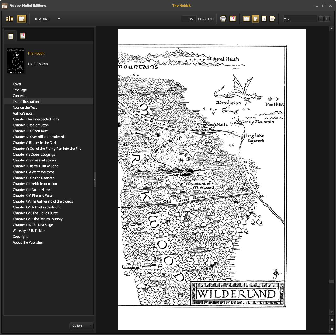 The images are vastly different in size. The ePub and LIT versions have very large images, the largest is the Map of Wilderland, which is 1,547KB and 1600x1258. The MOBI version is 81KB and 586x481. The eReader version is smaller still, 38KB and 360x282. The ePub version resizes to fit the screen, so it is probably an image inside a SVG. The PDF version is across 2 pages, and unfortunately the double page ADE option does not show both pages of the figure.