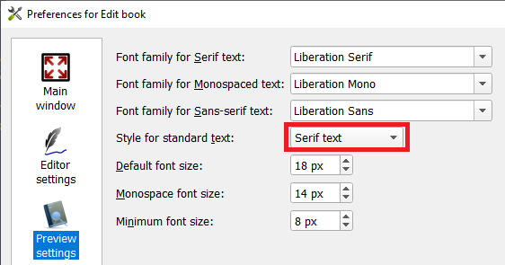 Trying to change in the editor preferences, for the preview window the "style for standard text" settings does not work for any of the options "sans text", "serif text" or "mono text" in calibre 64bit.