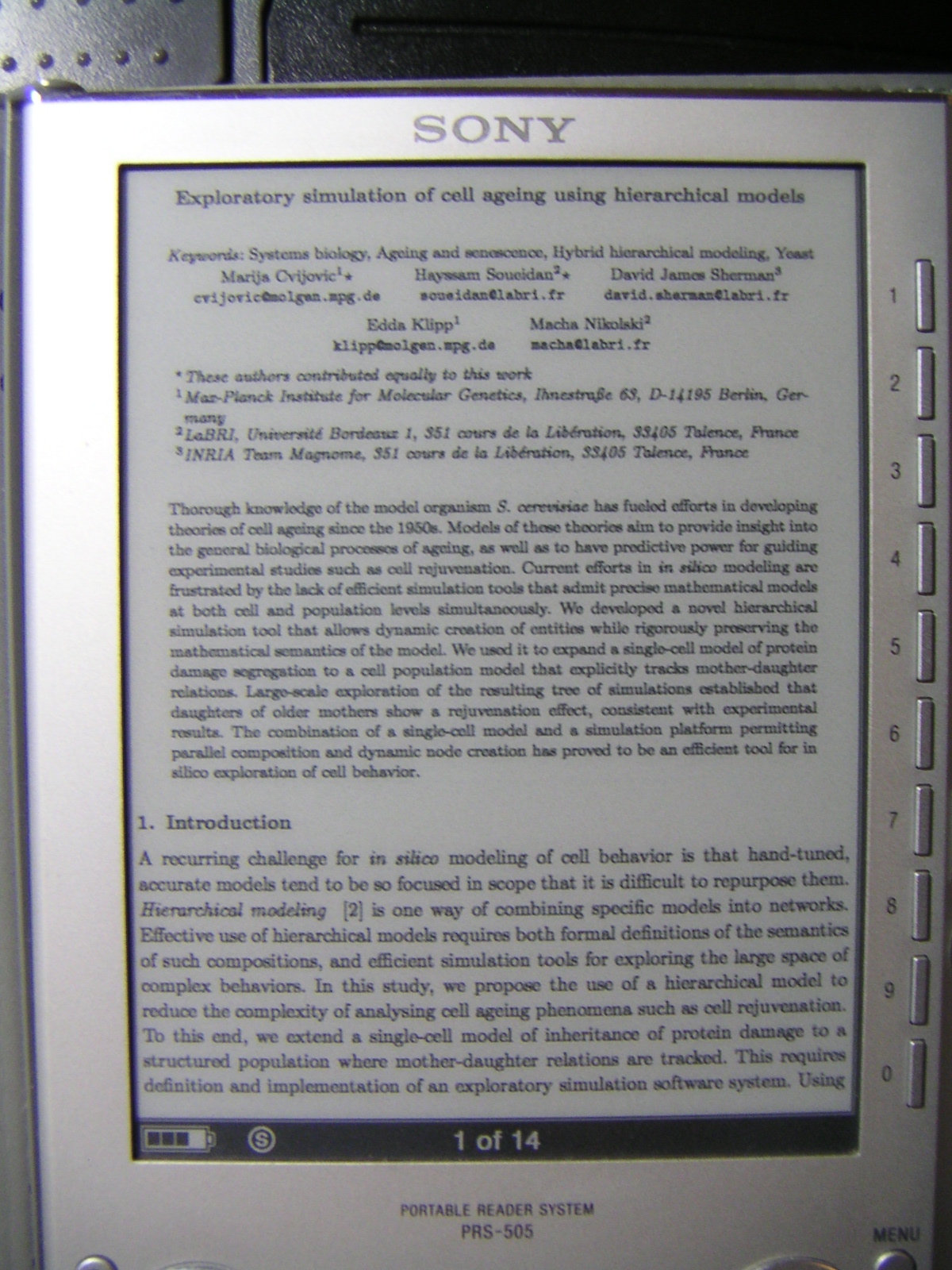 I've read most of the reviews for most of the devices available in France (PRS505, Cybook, Bebook) at a reasonable price. I'm on the edge of buying a Bebook, for its long battery life and more importantly, its PDF Support! Could somebody confirm this by posting some pictures of the bebook displaying this pdf : http://www.labri.fr/perso/soueidan/p...ell_ageing.pdf I'd interested by pictures of any page at the zoom level making it confortable to read for you... If you could give me your age too, I'd a happy and grateful fellow ![]() Thanks a lot ! |