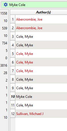 For instance I search for Myke Cole and get all the books listed, But also it shows 1 for Sullivan,Michael and 2 Abercrombie,Joe How do i get ONLY the Author I search for please ? Jim. |
