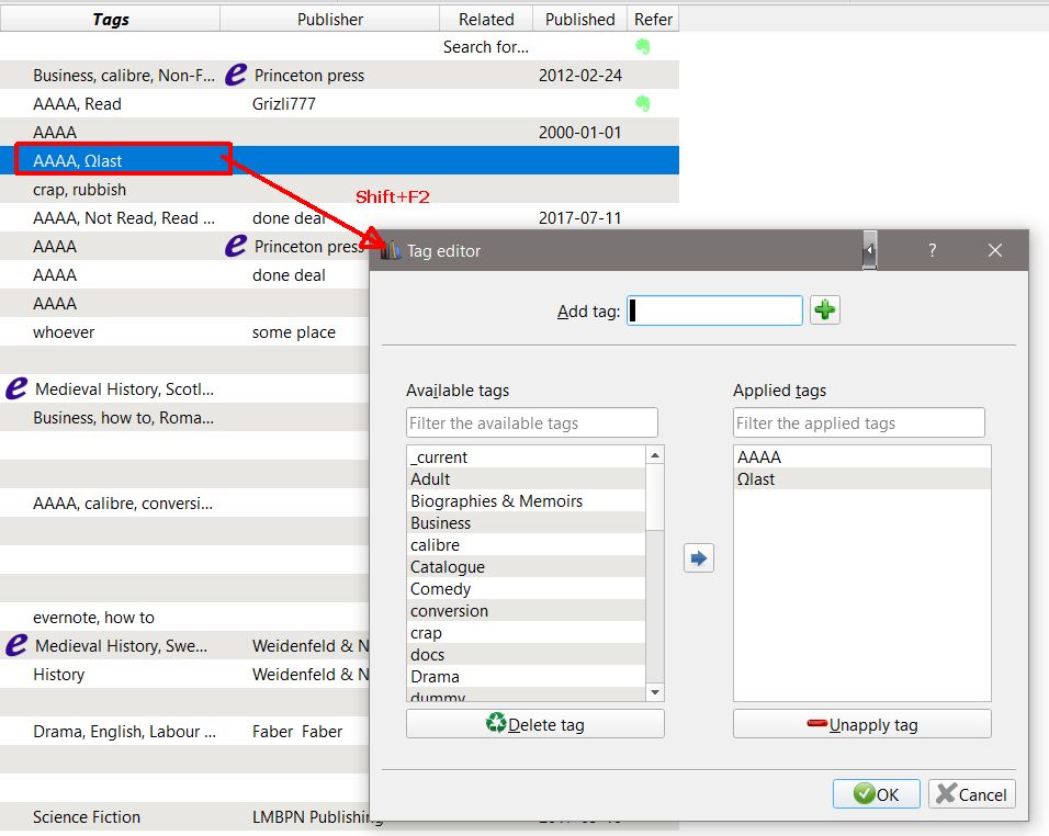 A VL needs some sort of criteria to subset the Library: Tags is just one of the possibilities. In most cases, The publisher bloats the Tag list by including every possible permutation of a books topic. I think of Tags as search 'Keywords" not the old (paper) card catalog, where you needed a card for each possible lookup. IMHO the Authors name does not belong in 'Tags" There is a DublinCore place for that. Same goes for ANT standard (and most times,REQUIRED) metadata OTOH they need to tag Series there because there is no STANDARD for series. Because Calibre does deal with Series, you should move that (and/or move it from the title) to The {series} field Tags are entered into the Metadata of a Book (use the Metadata editor or MDE download). That also auto-populates the Tag browser list and that list becomes suggestions when entering other tags. (you just killed all the books tags when you deleted those)Moderator Notice