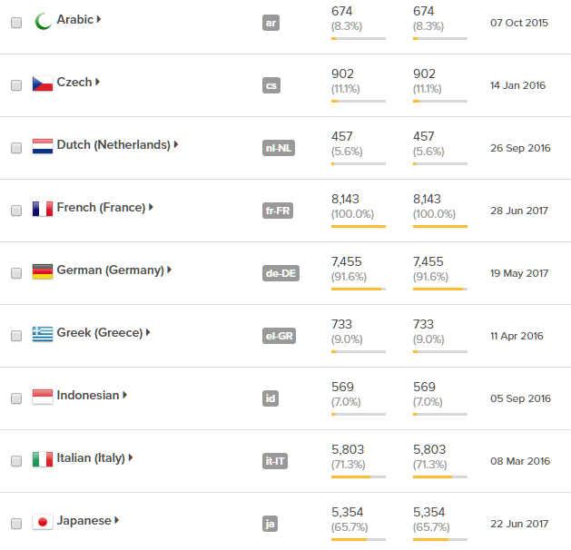 Once signed in, choose the language that interests you. Next, translate phrases or make comments on phrases already translated. You can also enter alternate phrase translations for phrases already translated, in which case current translators will be notified and can vote for the one they prefer. If your language is not available on the workbench, write a comment on this thread or send me a PM to ask me to add that language. If the language has country variants then please tell me which variant you are using. For example, if you want to do a translation for Portuguese, let me know if you are in Portugal or Brazil. Thank you in advance for your help. ![]() Note On Complexity And Amount Of Work Please note that CC is not a simple app to translate. As of July 2017 CC contains 796 distinct phrases, with 8,143 words. Even hitting the 10% floor for having a language included in CC requires a lot of work. Administrative Details: I will include a translation in CC once more than 10% of the phrases have been translated into that language. This is the same metric that calibre uses. For testing: I will build an APK of the CC demo version containing all translations every Friday or Saturday when there has been translation activity that week. A link to download the latest APK is at the bottom of this message. Finally, please tell me via private message or by email to cc_translations at charles dot haleys dot org how you want to be credited for your work. The choices: any of "anonymous", your MobileRead forum name, your real name (first, last, or complete name), a company name, or an email address will do. You can have your name be clickable, opening an email window addressed to you or opening your web site. If you want this, let me know in the message and give me the URL or target email address. If I don't hear from you then I will use "anonymous". See "Translation Credits" in CC's menu for examples. Translation status as of 29/June/2017 (2 images): Link to latest CC Demo version with all languages: (current production release). This build includes the translations that have not crossed the 10% threshold. Last edited by chaley; 06-29-2017 at 12:44 PM. |