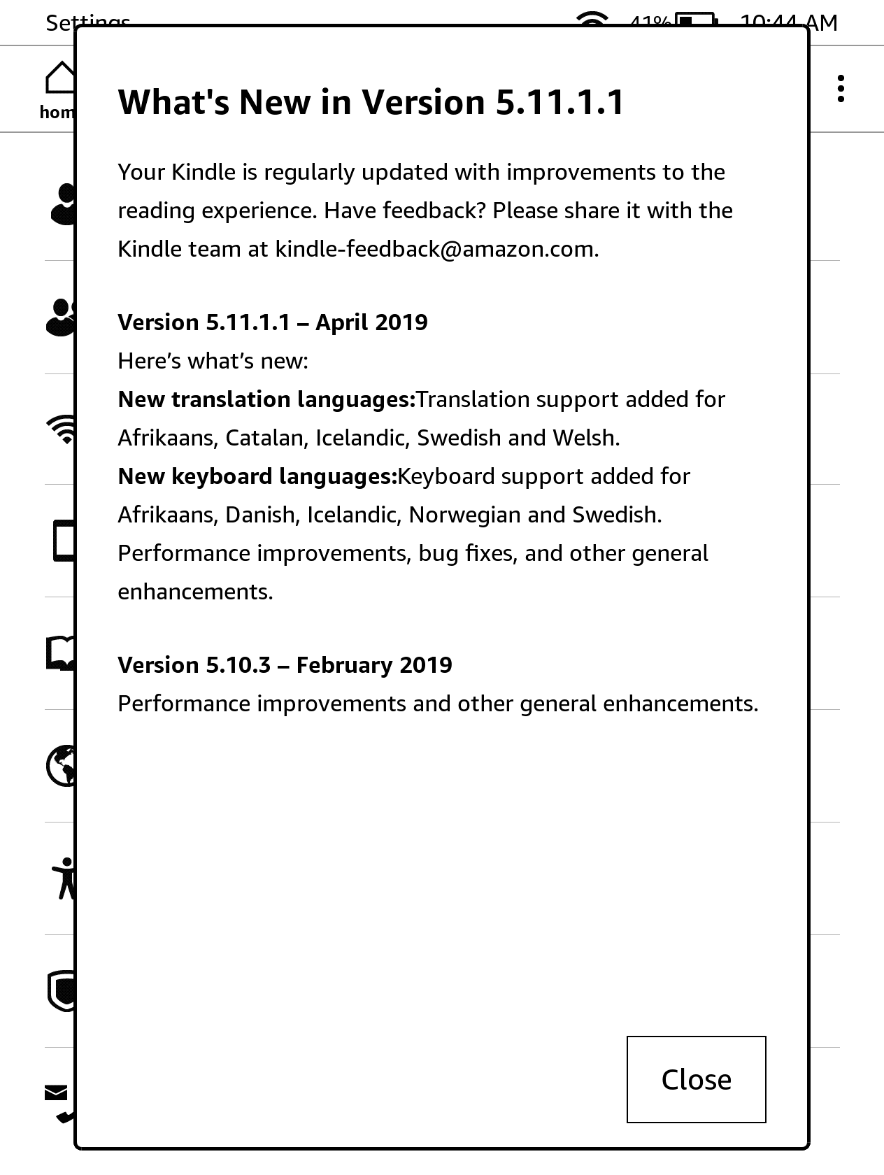New firmware has been released for pre-10th generation kindle, I got my Oasis 2017 updated today: What's New: New translation languages: Translation support added for Afrikaans, Catalan, Icelandic, Swedish and Welsh. New keyboard languages: Keyboard support added for Afrikaans, Danish, Icelandic, Norwegian and Swedish. Performance improvements, bug fixes, and other general enhancements. I didn't notice any difference regarding the performances and bugs. I didn't see those languages in the languages setting (but they are available in keyboard setting). Last edited by plainbriny; 04-10-2019 at 06:51 AM. |