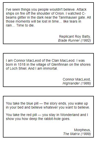 The use of <blockquote> is more semantically correct when creating a block quote, whereas a <div> is a simple division, and classed paragraphs are just formatting the paragraph. Yes, you can make them look the same, but using a blockquote when you have a long quote (usually of multiple paragraphs) sets up your document properly. P.S. You can style blockquotes to look any way you want with CSS and the target renderer will treat it just as well/badly as it would treat any other CSS. example: Spoiler: