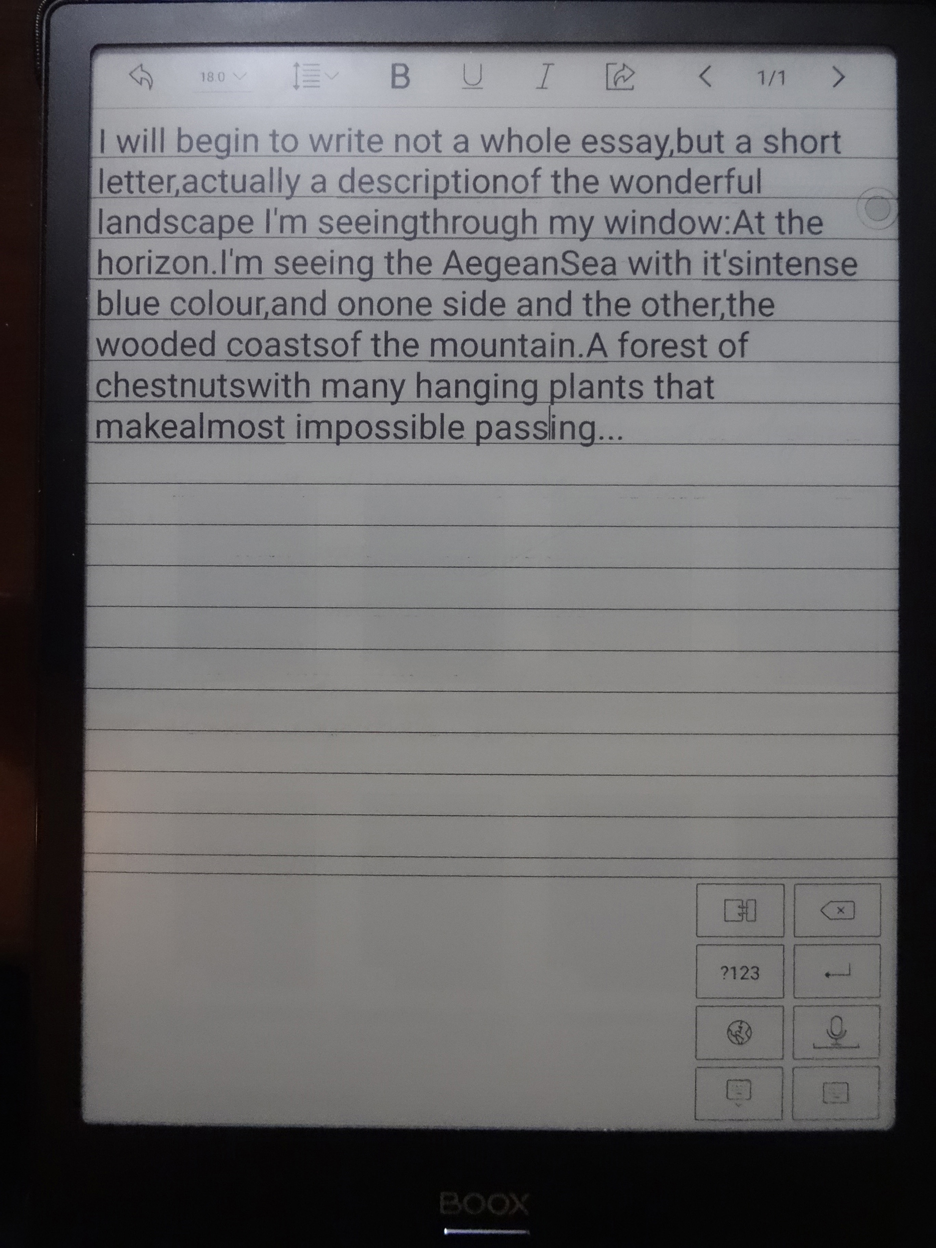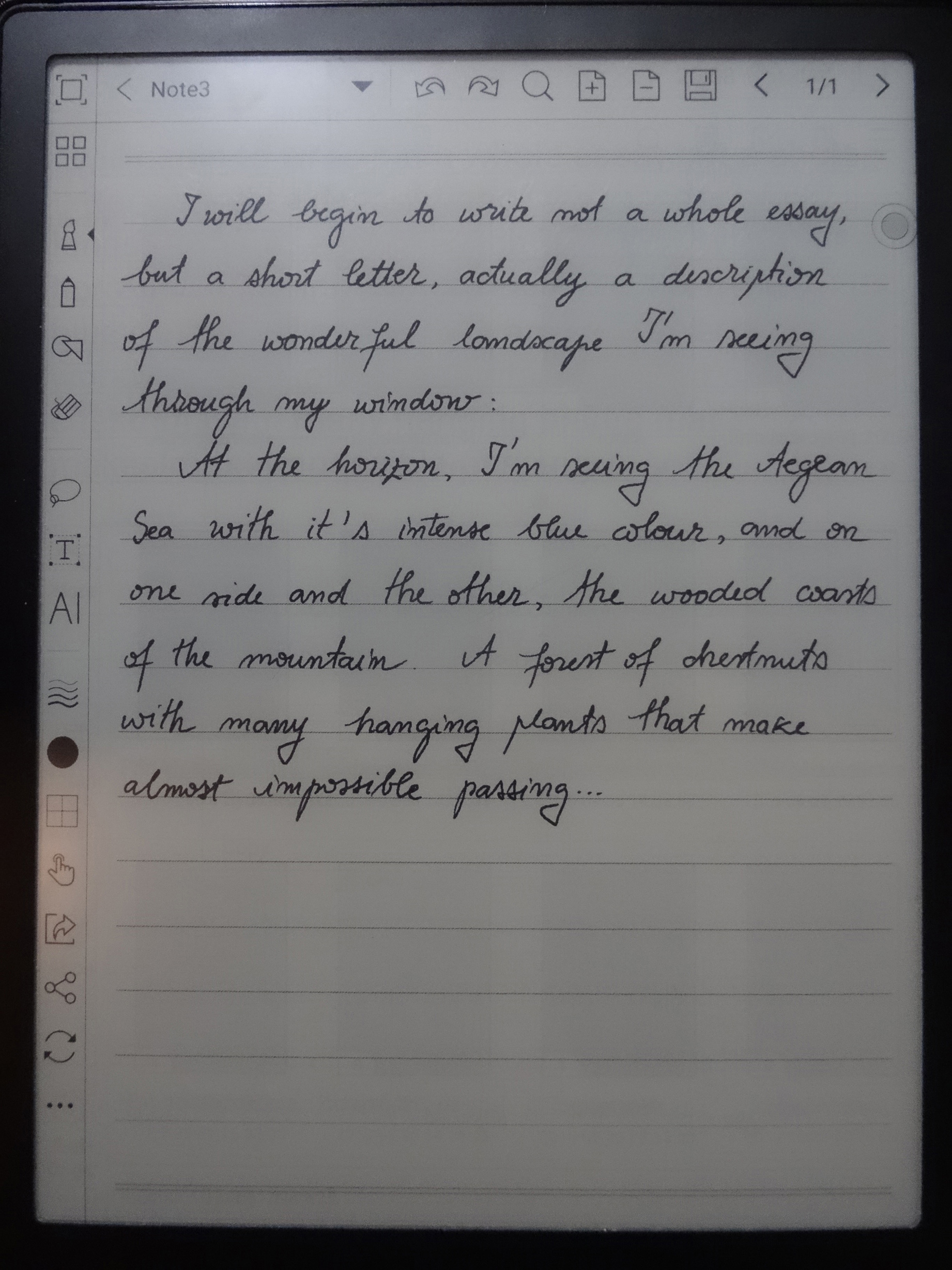 I've noticed that if the handwriting is very small (the letters are half of the normal height) the recognition is almost perfect, but in this case the handwriting note itself is not very showy. Also the recognition works very well for 3-4 words or a sentence (when writing with the Onyx virtual keyboard in a text input application like iaWriter for example). |