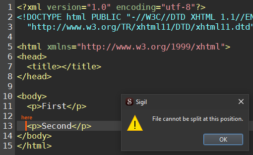 so if CV shows something like |<tag> , then the cursor is in the tag. If you had a block cursor it would highlight the < but CV uses an insertion point cursor. The long held Sigil rule is you can not split when in a tag. If you think this is too tight, the I would be happy to consider a patch or PR that handles just that one case. Note, a file with an xml file extension can be of any type, it could be an opf, an ncx, an xhtml, a generic xml file, etc. There is no way to know the tag meanings: a body tag may not be what you think it means, there may be no html root tag, there is no way to tell which are void tags and which are not, which are block tags and which are not, where it might even be safe to split, and how splitting will impact a generic xml file. And according to the epub3 spec, file extension must be xhtml if the file is an xhtml file. The first step when seeing lots of xml files that are really xhtml files (or html files that are really xhtml files) is to use Sigil's ability to bulk rename a set of files by just changing the extension as they do not meet the current epub spec left as .xml files. Again, I would consider a patch or PR to handle this differently but Sigil has long operated this way, and forcing people to change file extensions to more correct ones that meet the latest spec makes good sense to me. Please note, that old epub2 spec that allowed pure xml "islands" has long been deprecated mainly since no reader bothered to support it and just treated all .xml files as .xhtml files. This changed in epub3. Hope this explains why you are seeing what you are seeing. Quote: